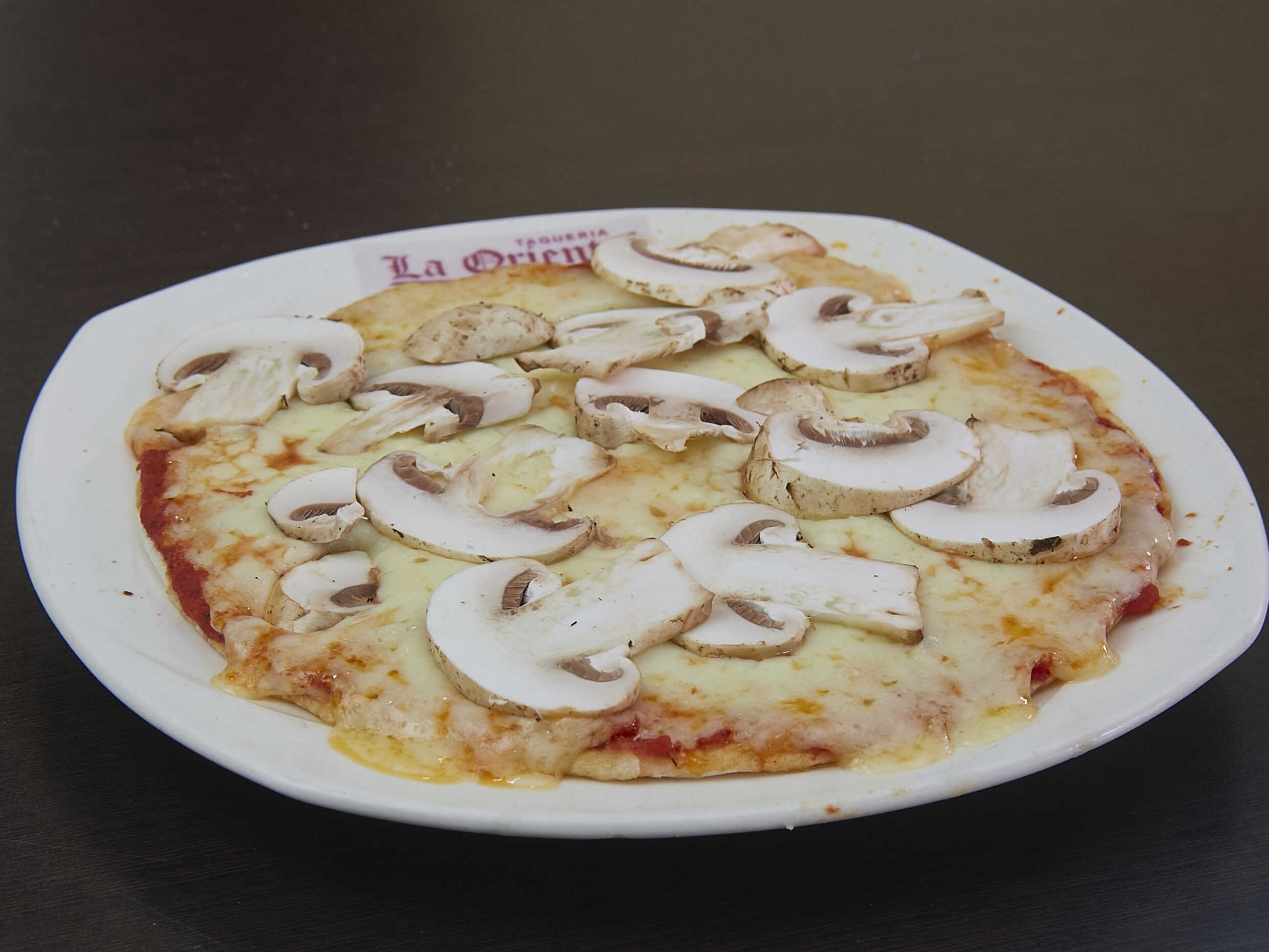 Pizza con salsa italiana, champiñones y queso mozzarella.
