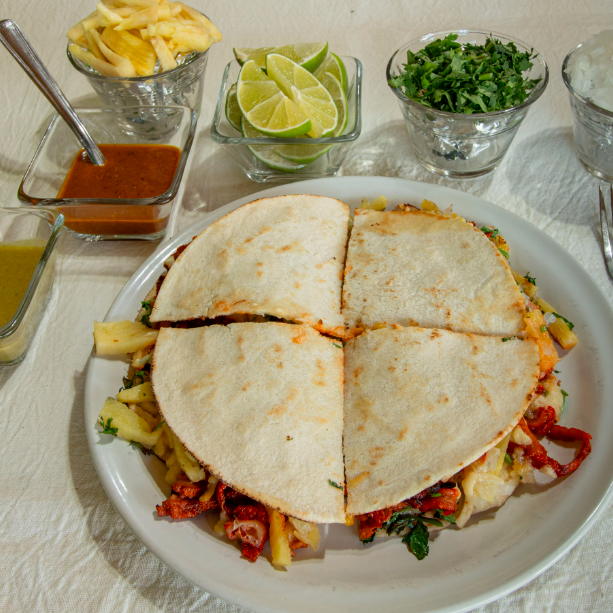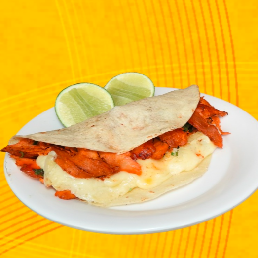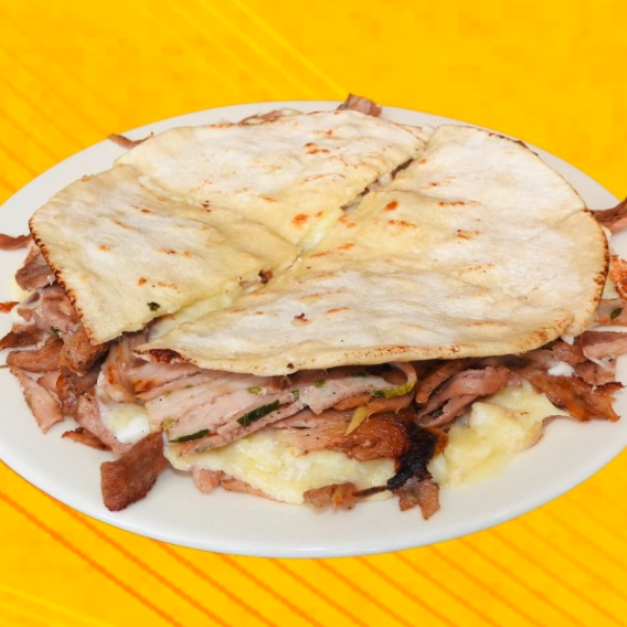 Dos tortillas de harina rellenas de queso derretido y la mejor carne al pastor. ¡La opción más gratinada y sabrosa!.