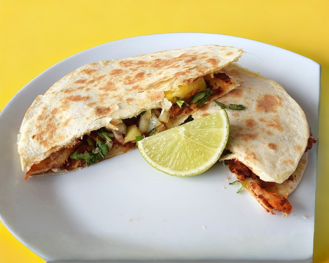Una tortilla de pan árabe, queso y carne al pastor.