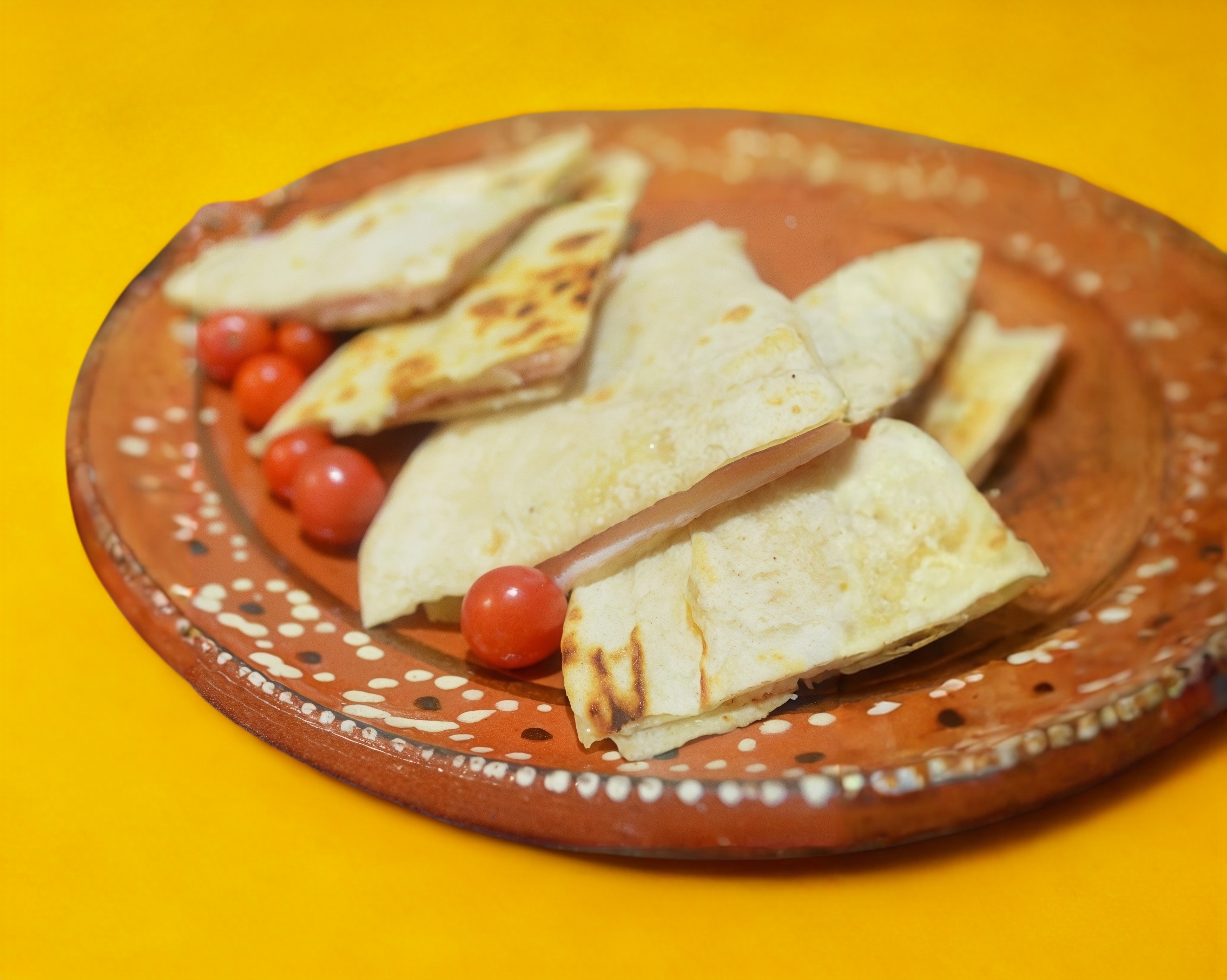 Doble tortilla de pan árabe, queso, jamón y carne al pastor.
