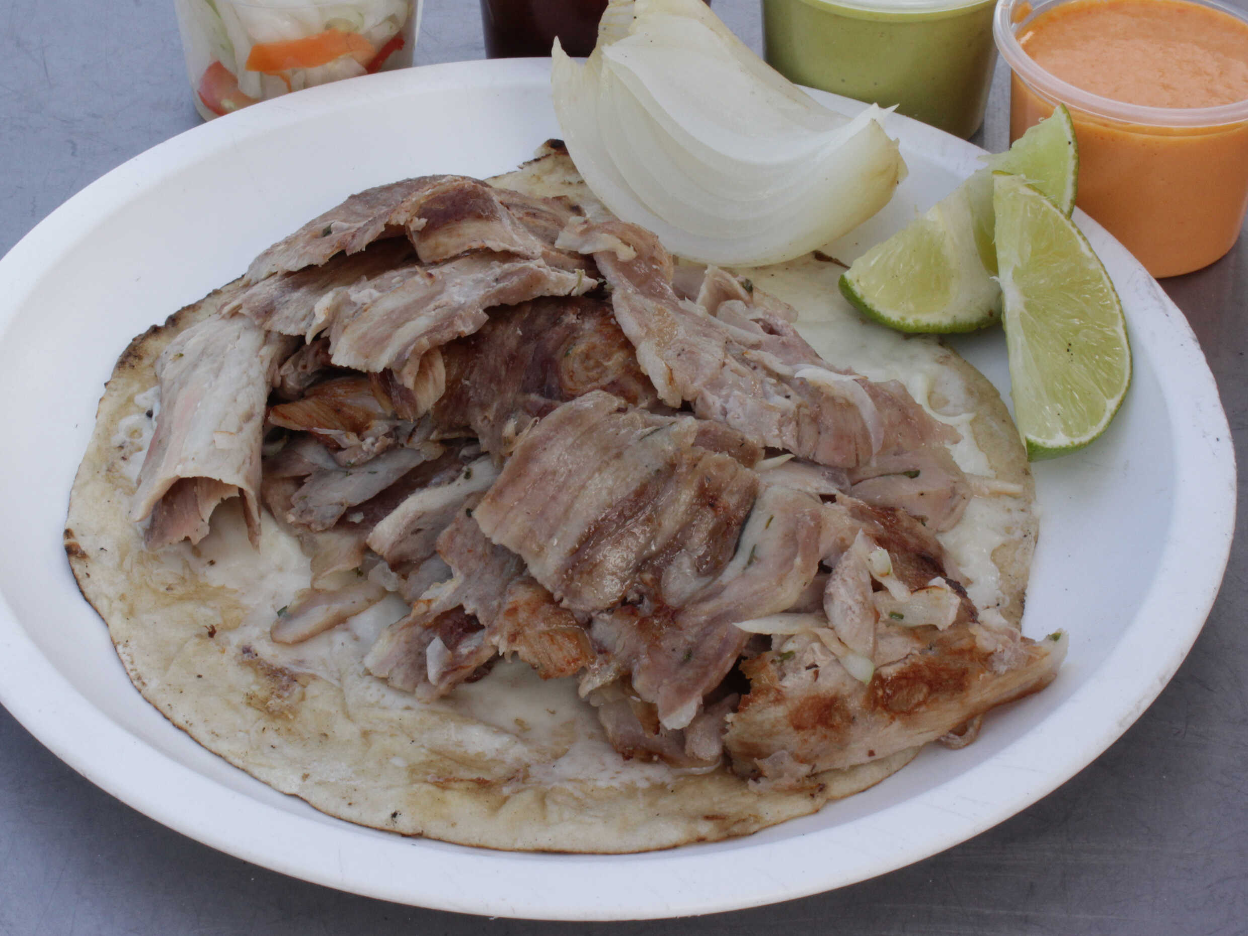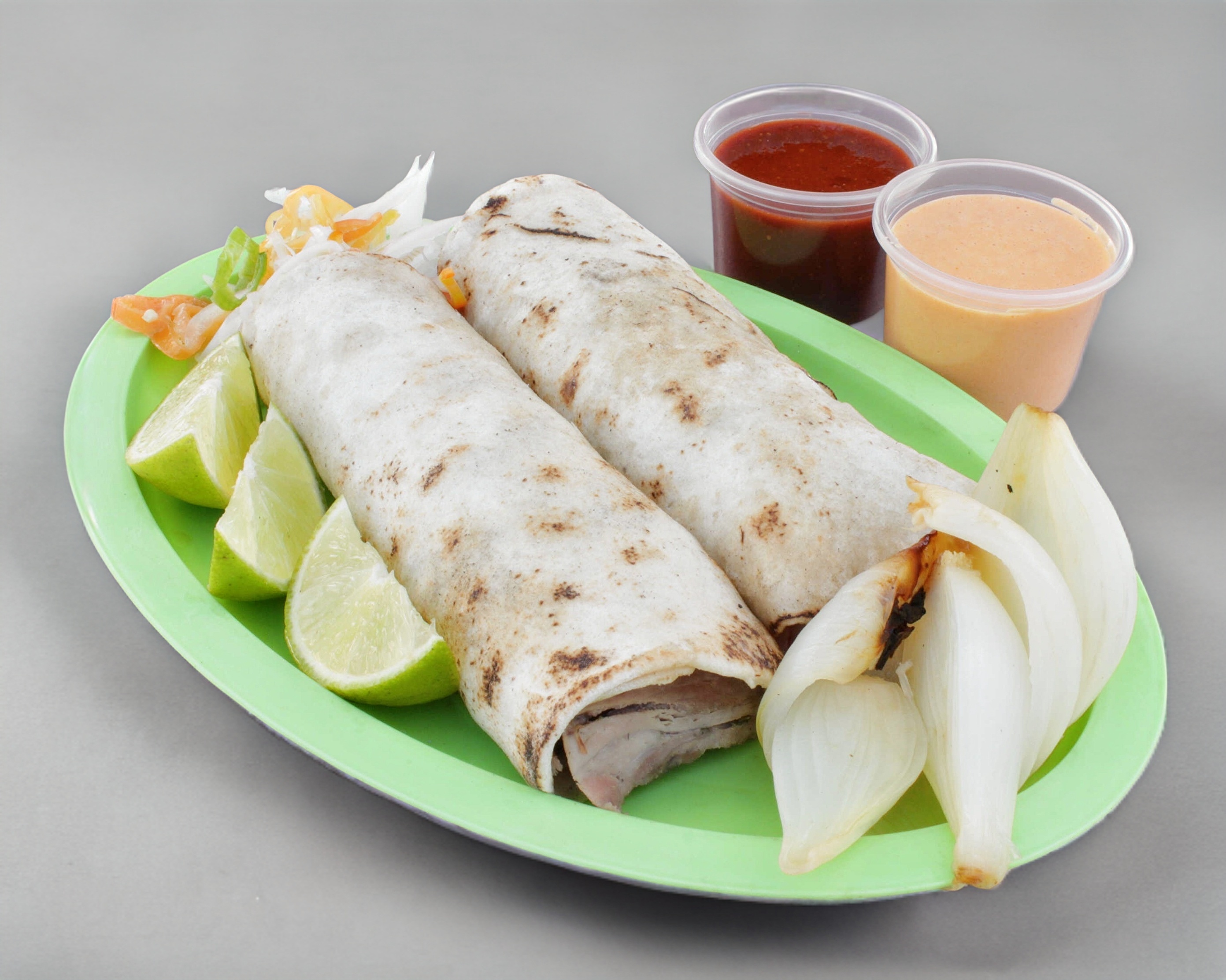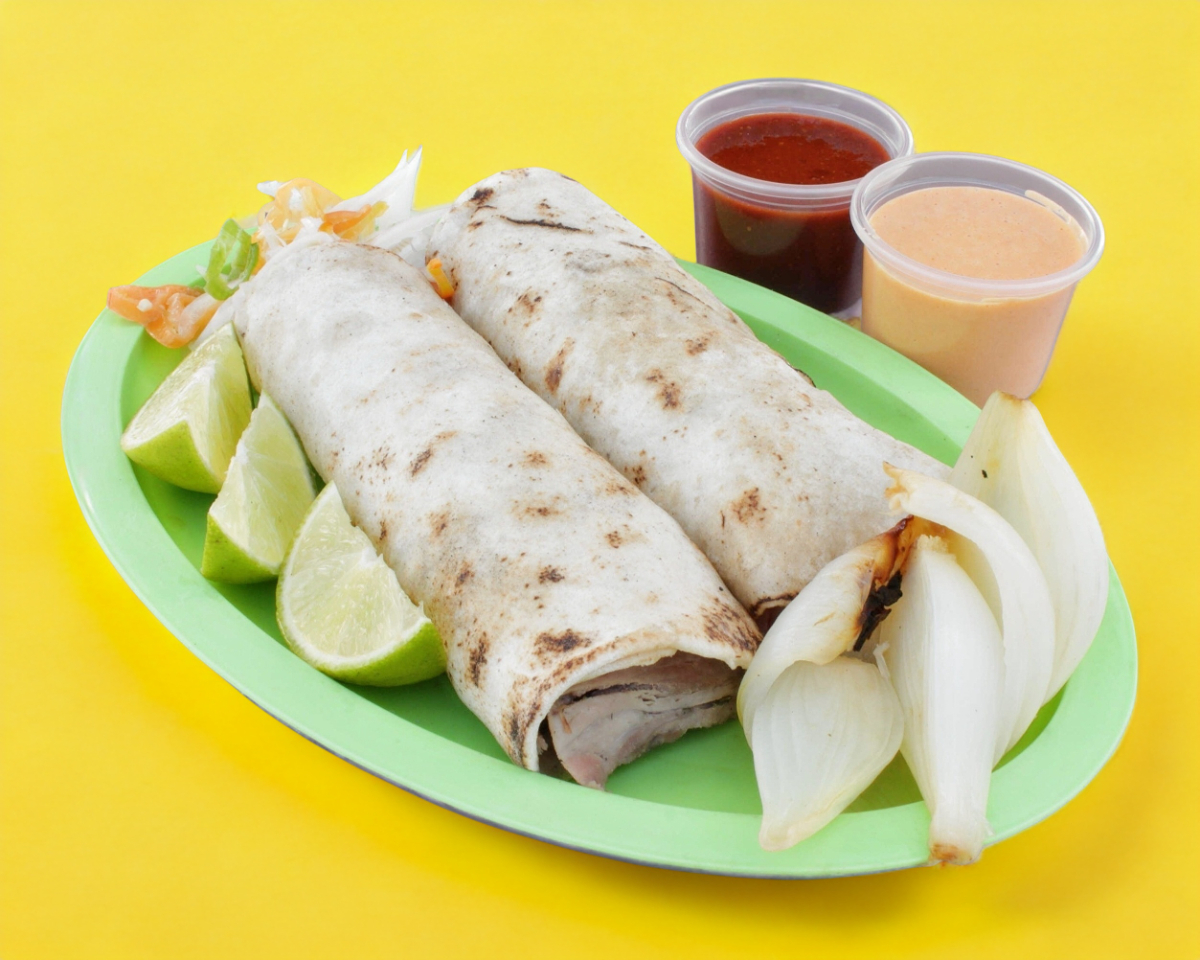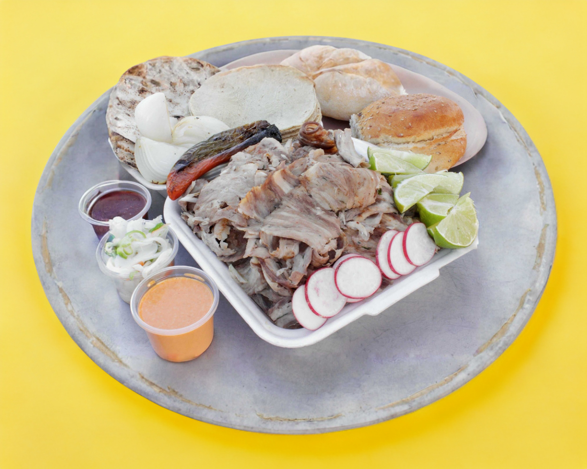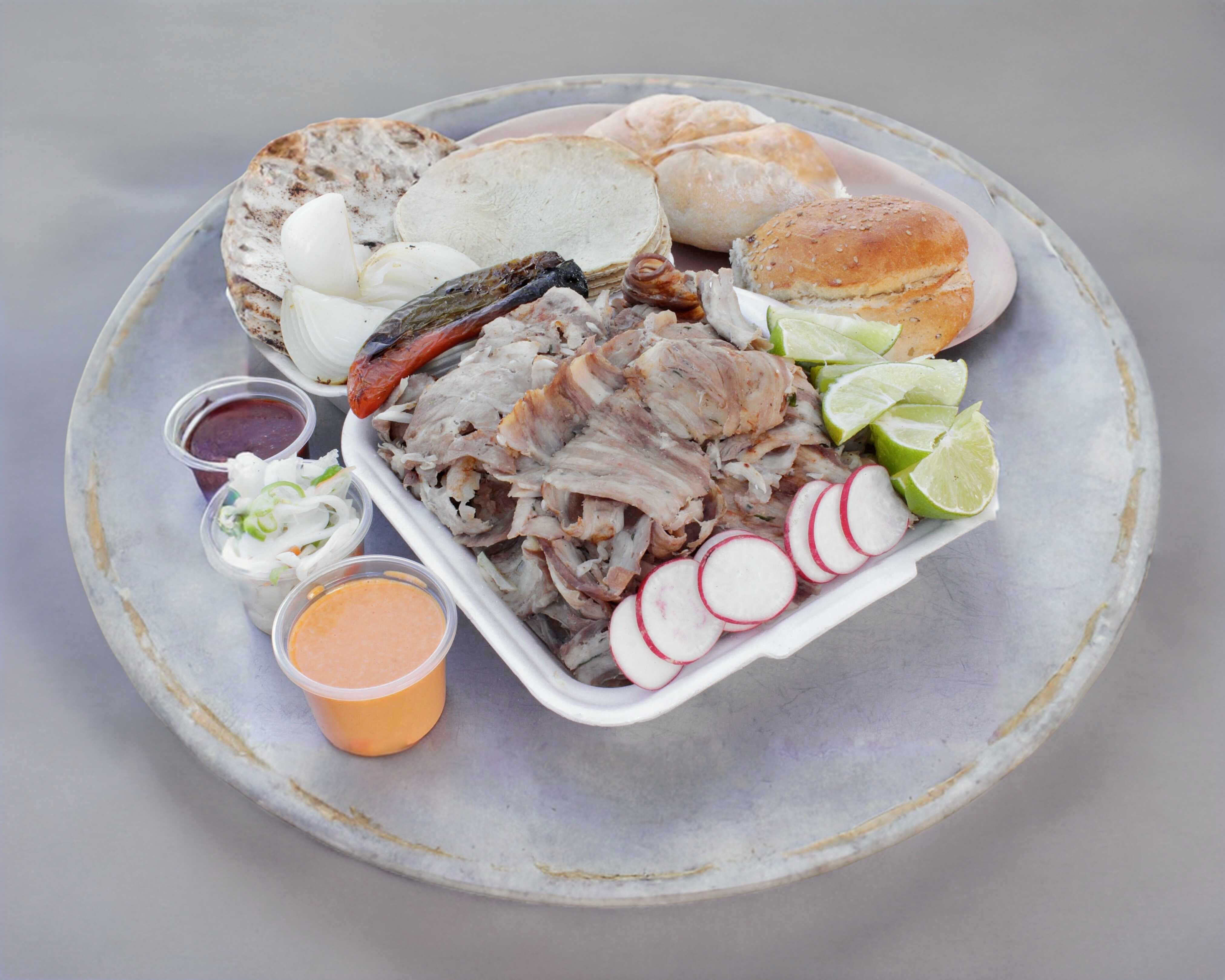 Kilo de carne arabe con 10 tortillas de harina, 10 tortillas de maiz, salsa roja y verde, limones y habaneros.