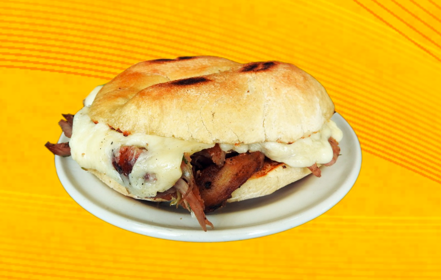 Torta rellena de carne al pastor con queso gratinado, acompañada de piña, cilantro, cebolla y salsa de la casa.