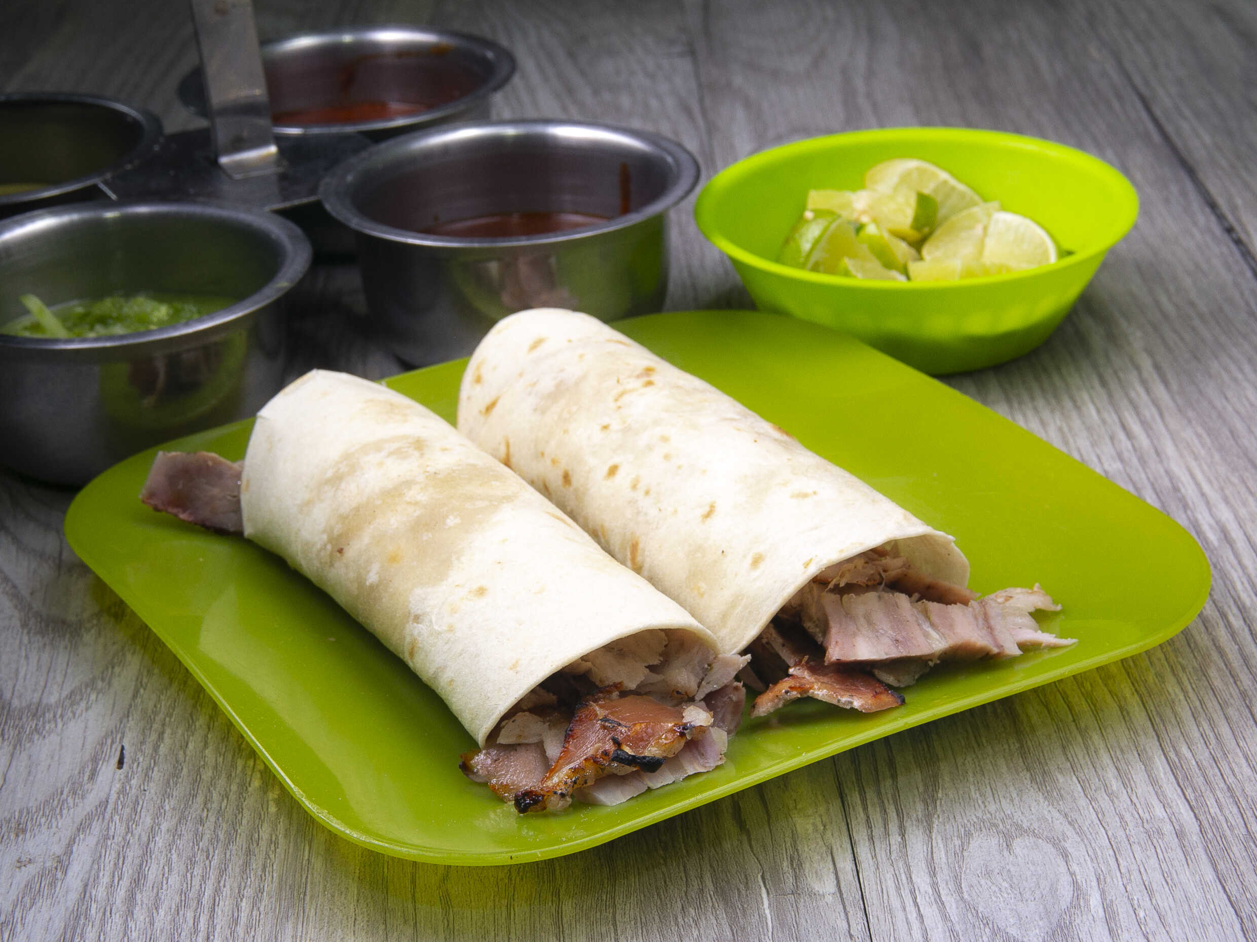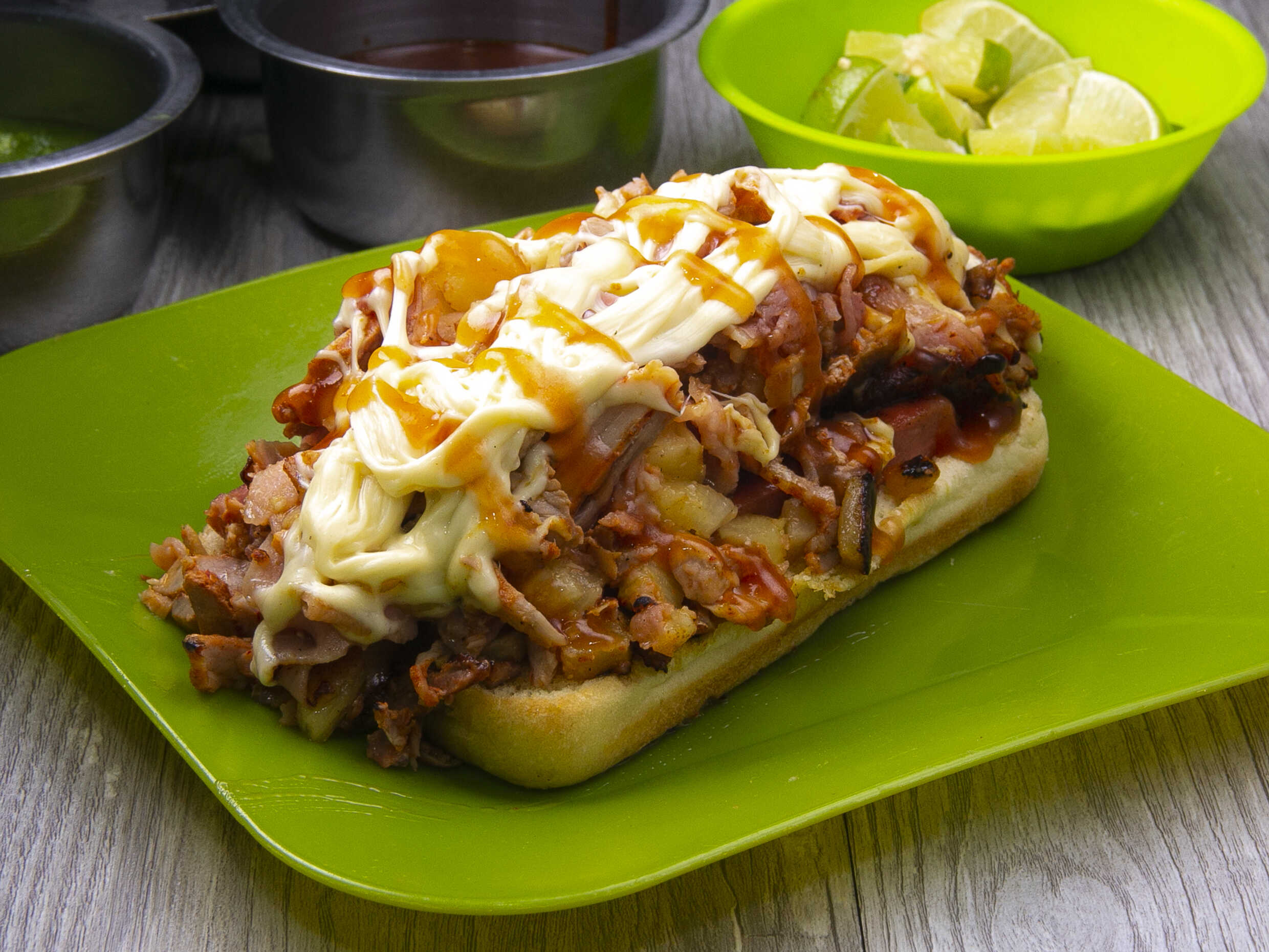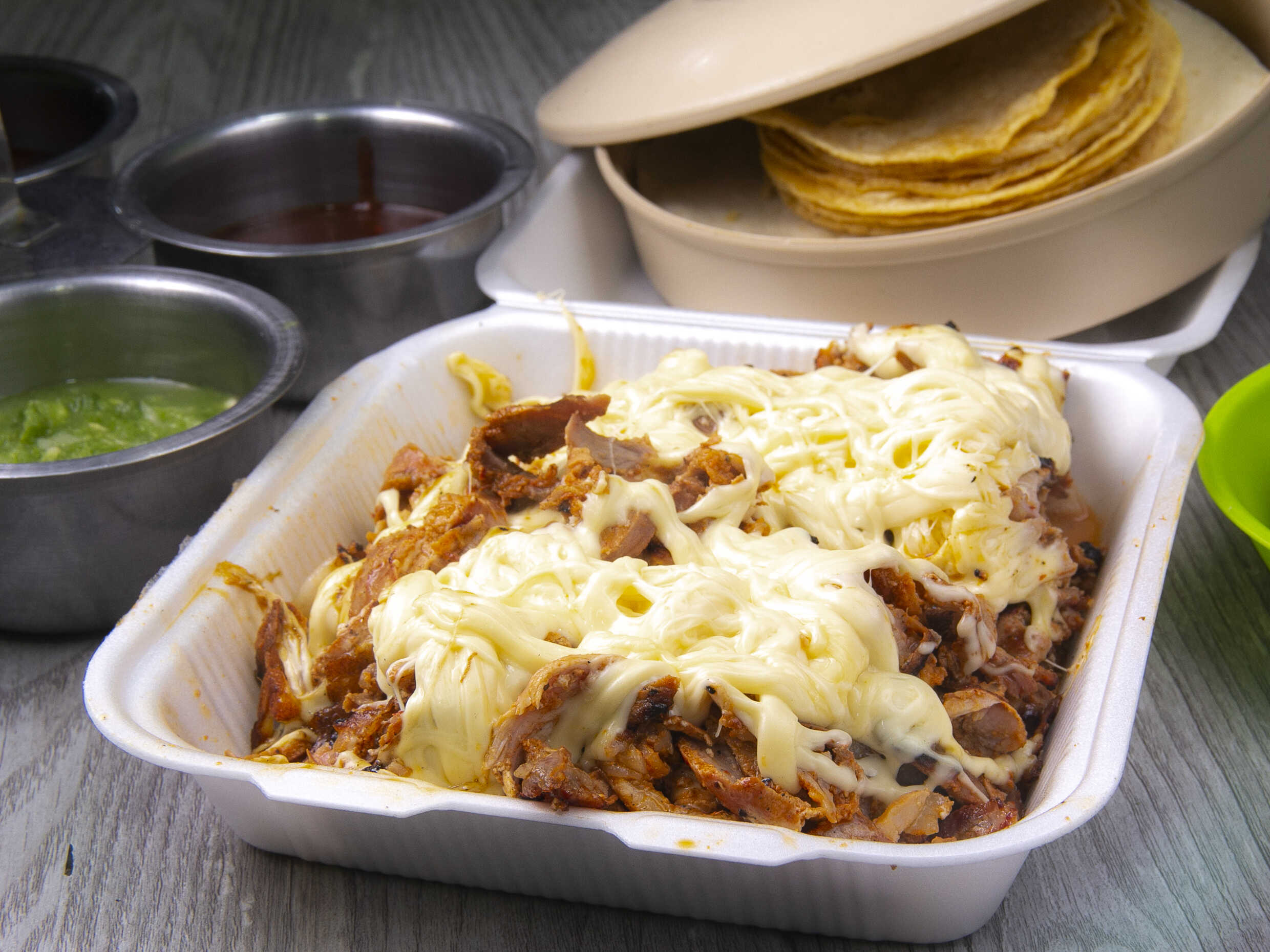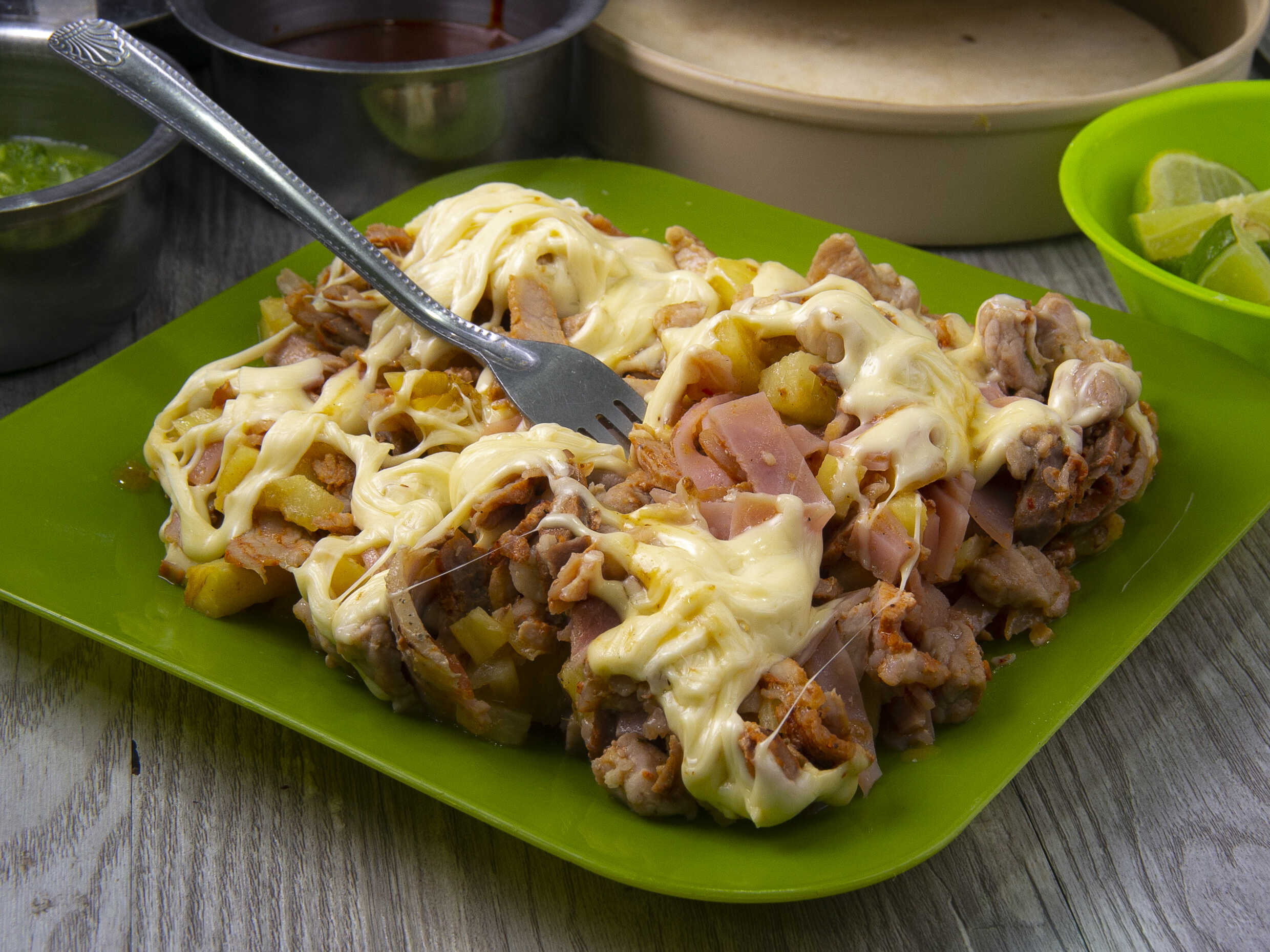 Chuleta, tocino, longaniza, queso y carne al pastor.