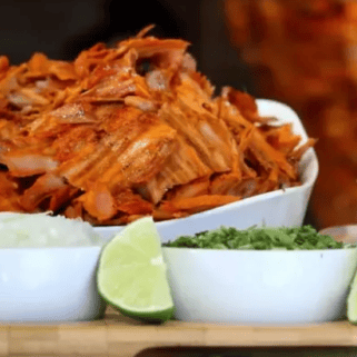 Un kg de pastor rojo, con tortillas, salsas, cebolla, cilantro, piña