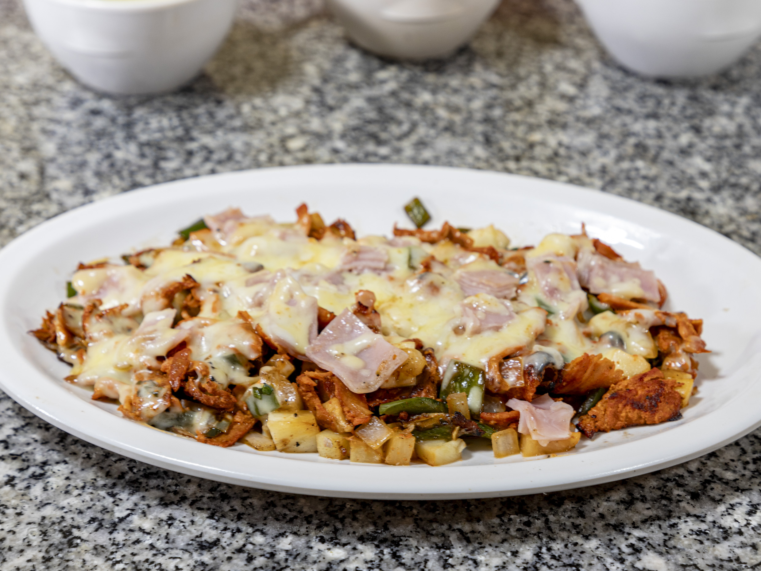 Bistec, tocino, jamón, chuleta, morrón, cebolla y queso.