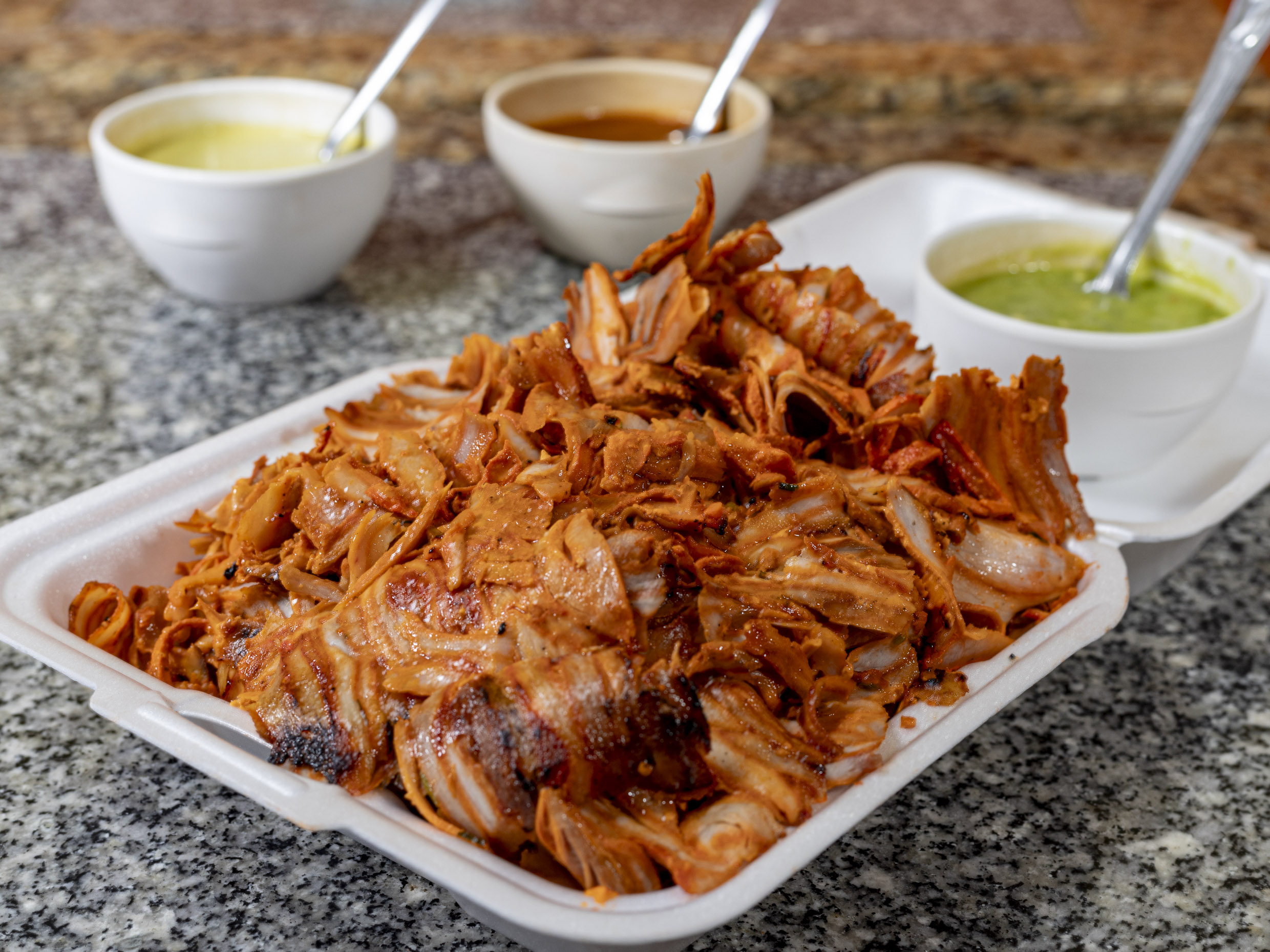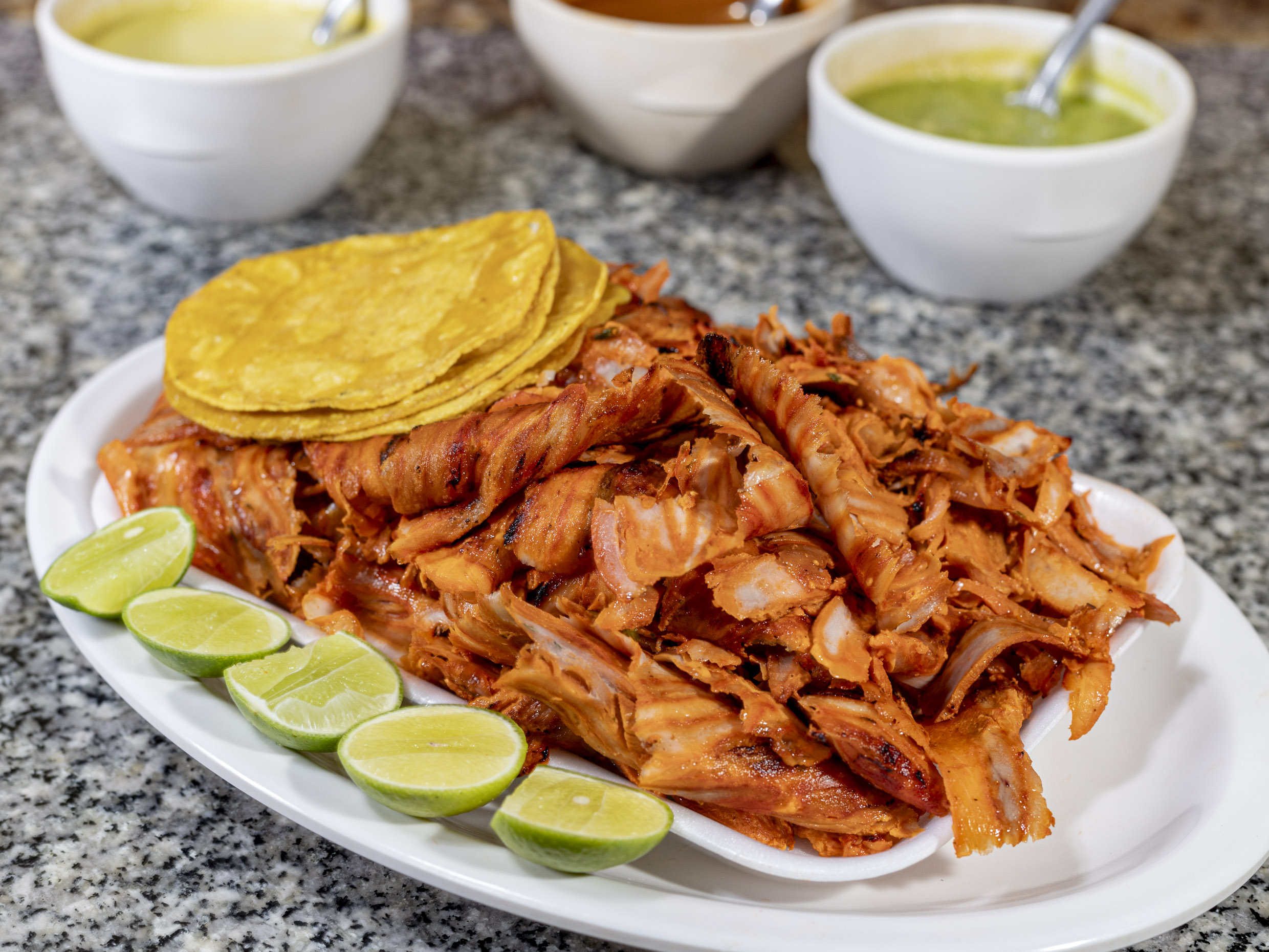 Un kilo de carne al pastor, ocho tortillas de harina, veinte tortilas de maíz, cilantro, cebolla, piña, tres salsas, limones y un refresco familiar.