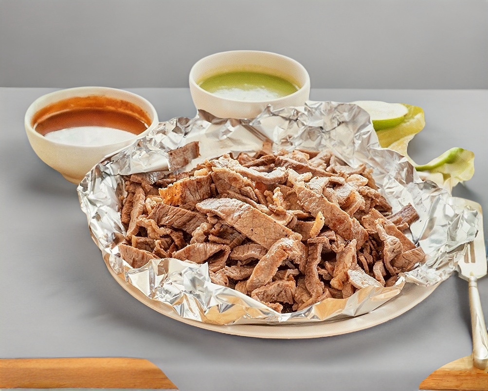 MEDIO KILO DE CARNE AL PASTOR Y MEDIO KILO DE BISTEC CADA UNO CON SUS COMPLEMENTOS QUE SON TORTILLAS Y SALSAS