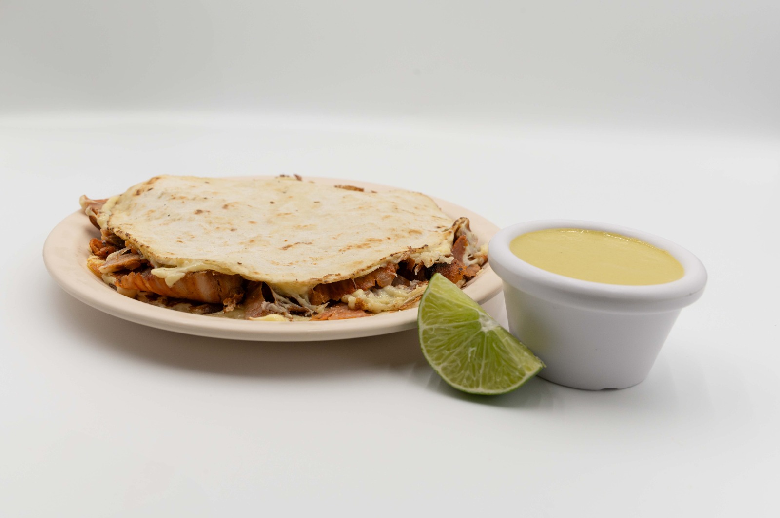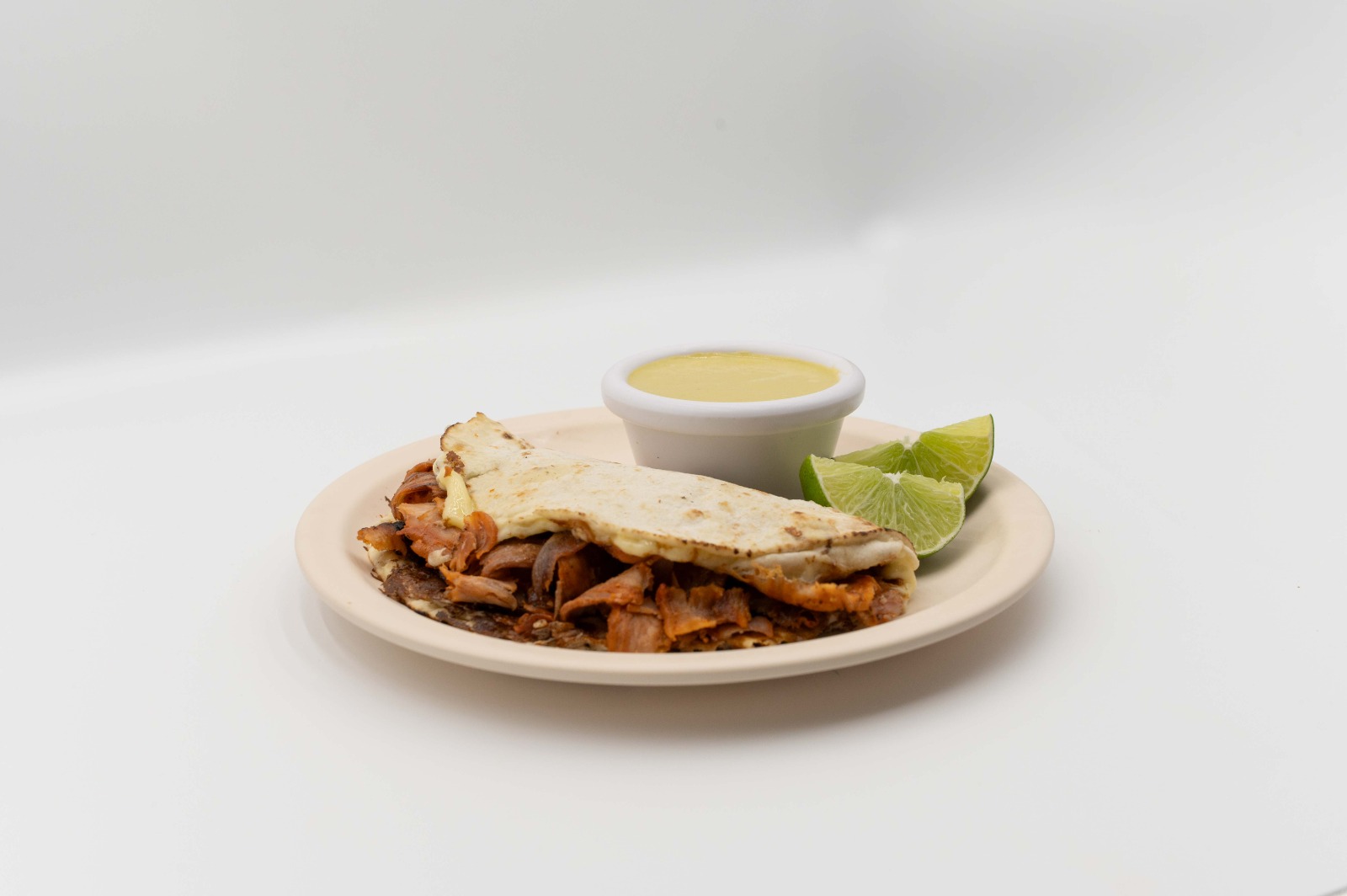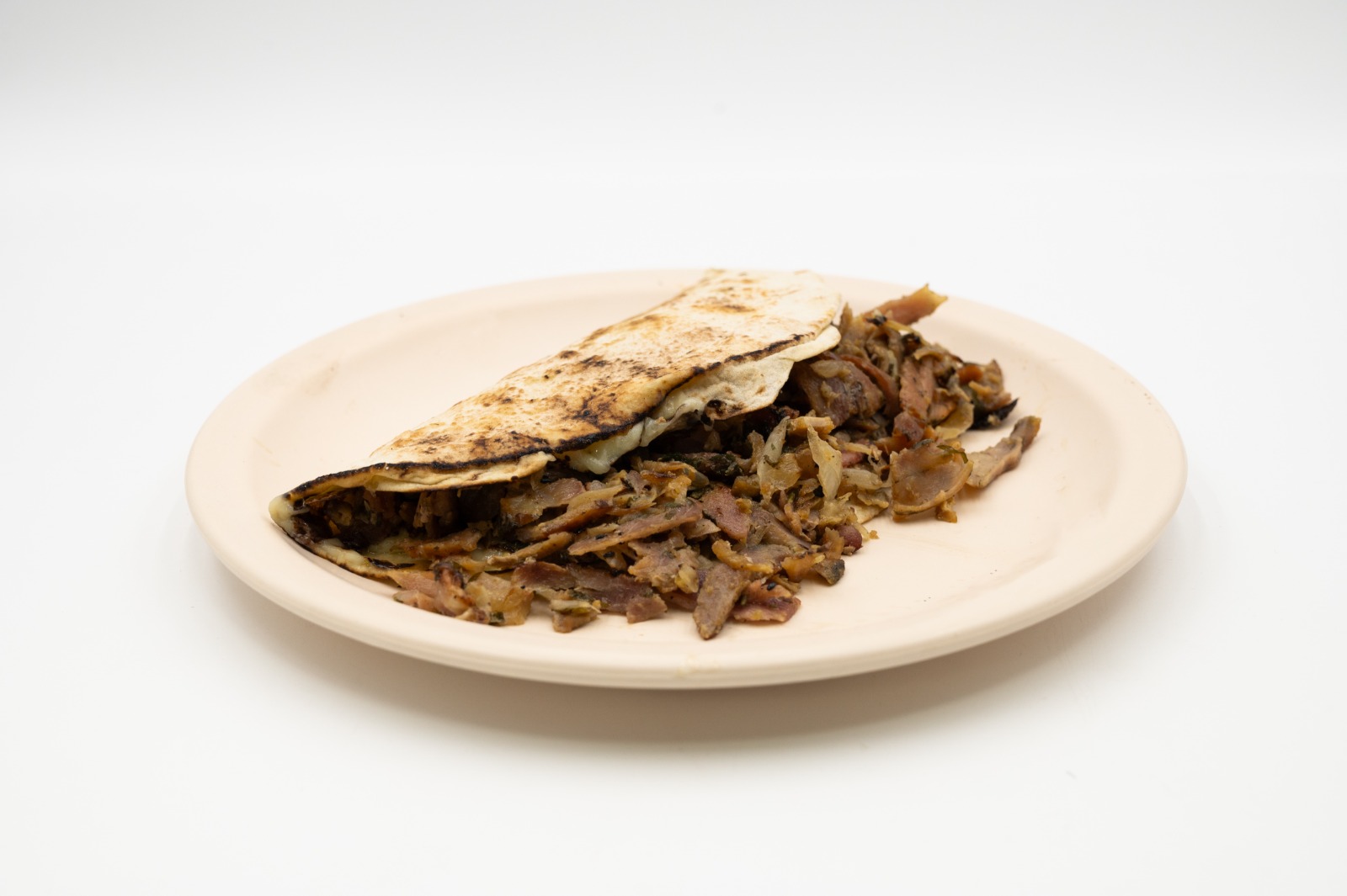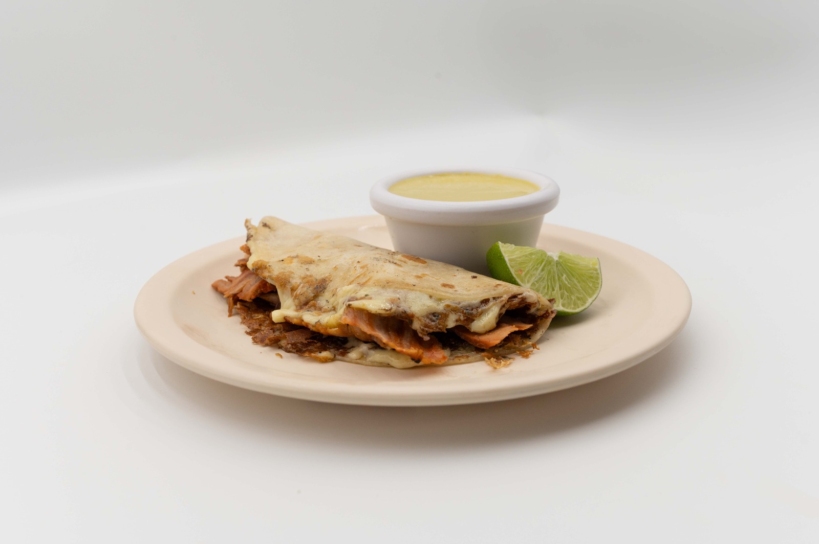 Tortilla de harina rellena de carne al pastor con queso, dorada a la plancha.