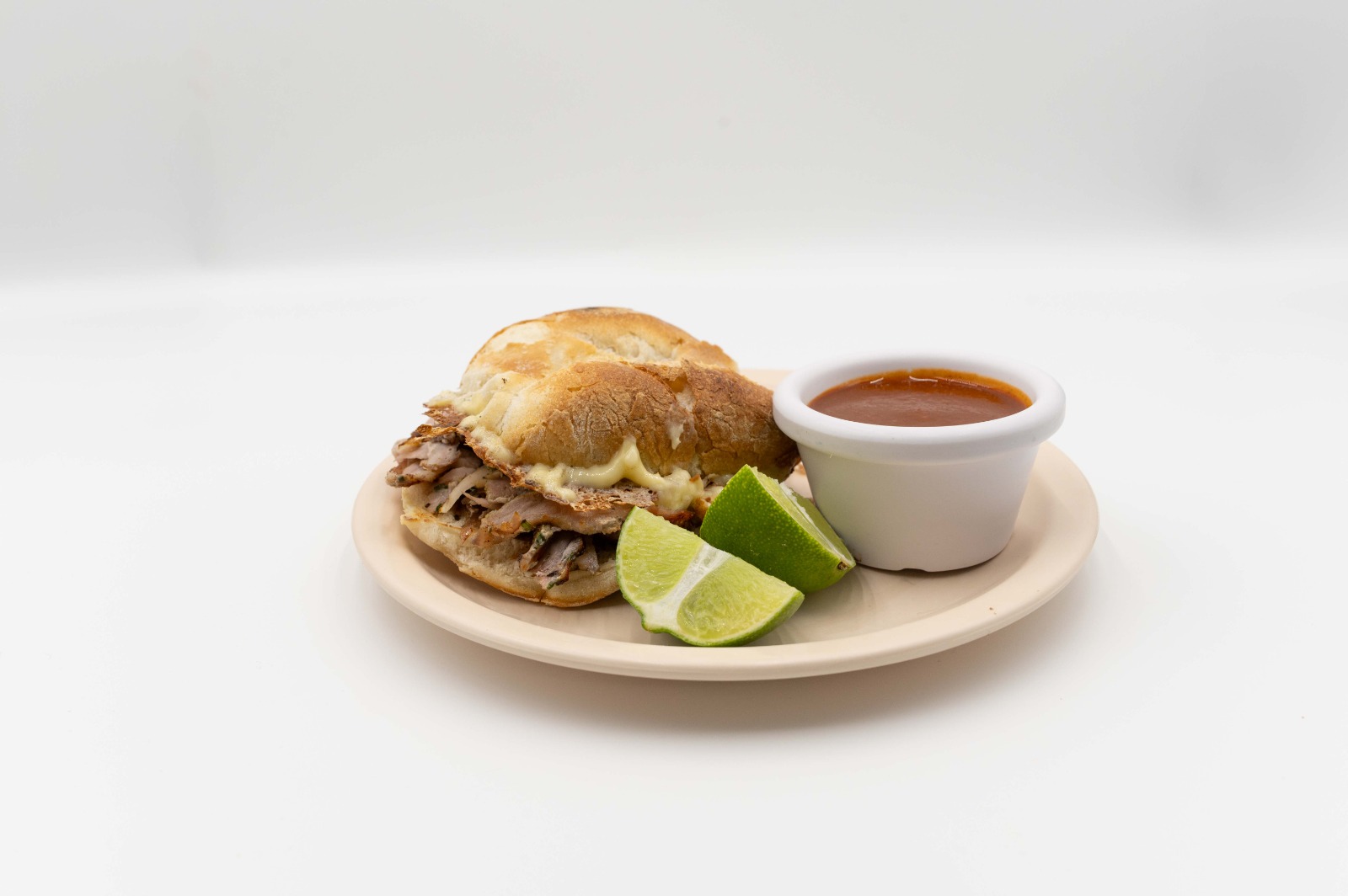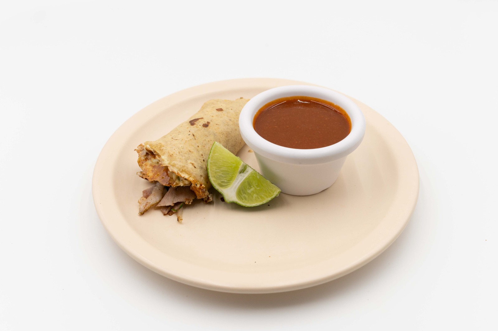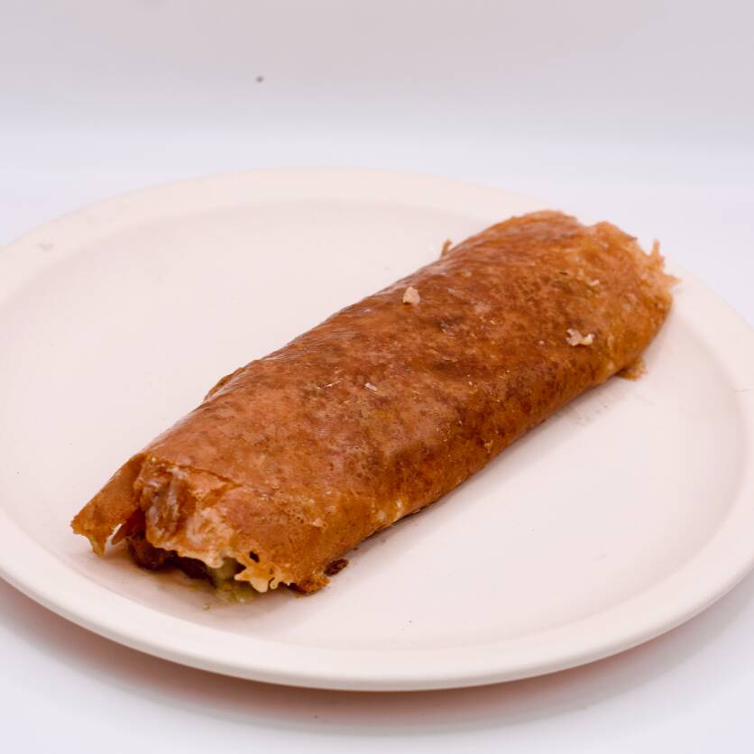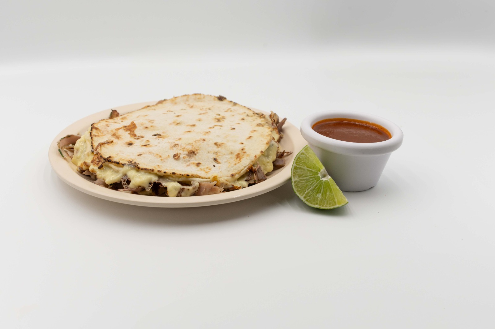 Tortilla de harina rellena de carne al pastor con queso, dorada a la plancha.
