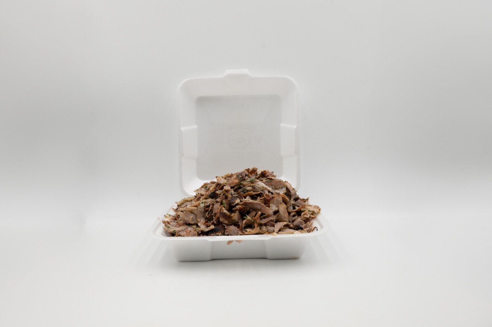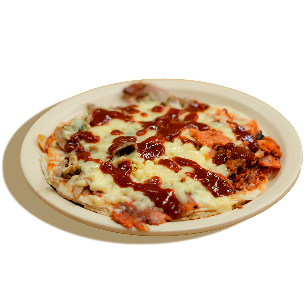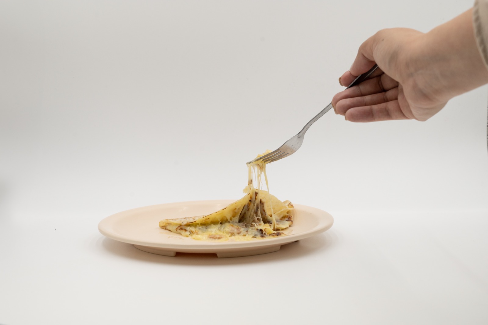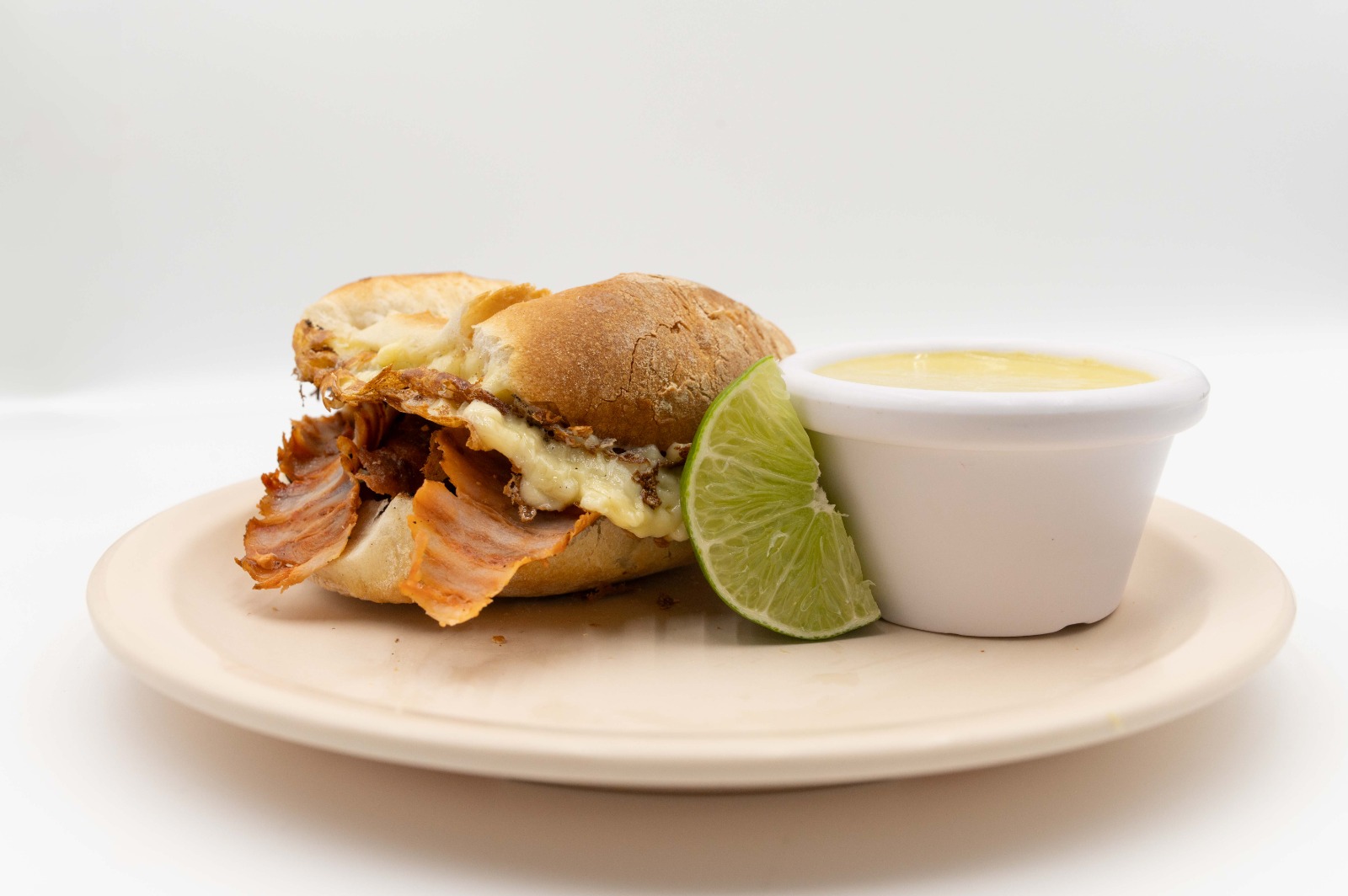 Tortilla de harina rellena de carne al pastor con queso, dorada a la plancha.