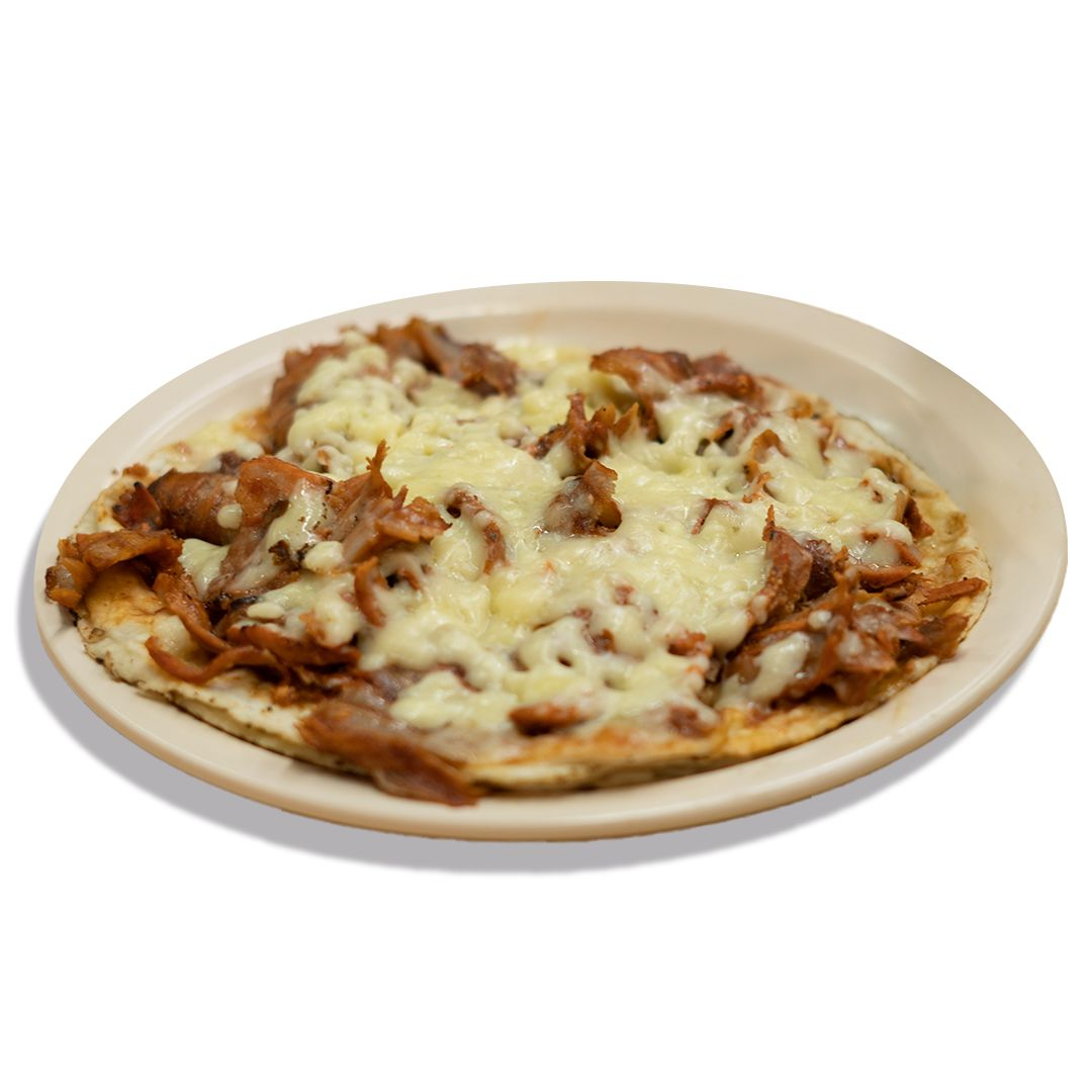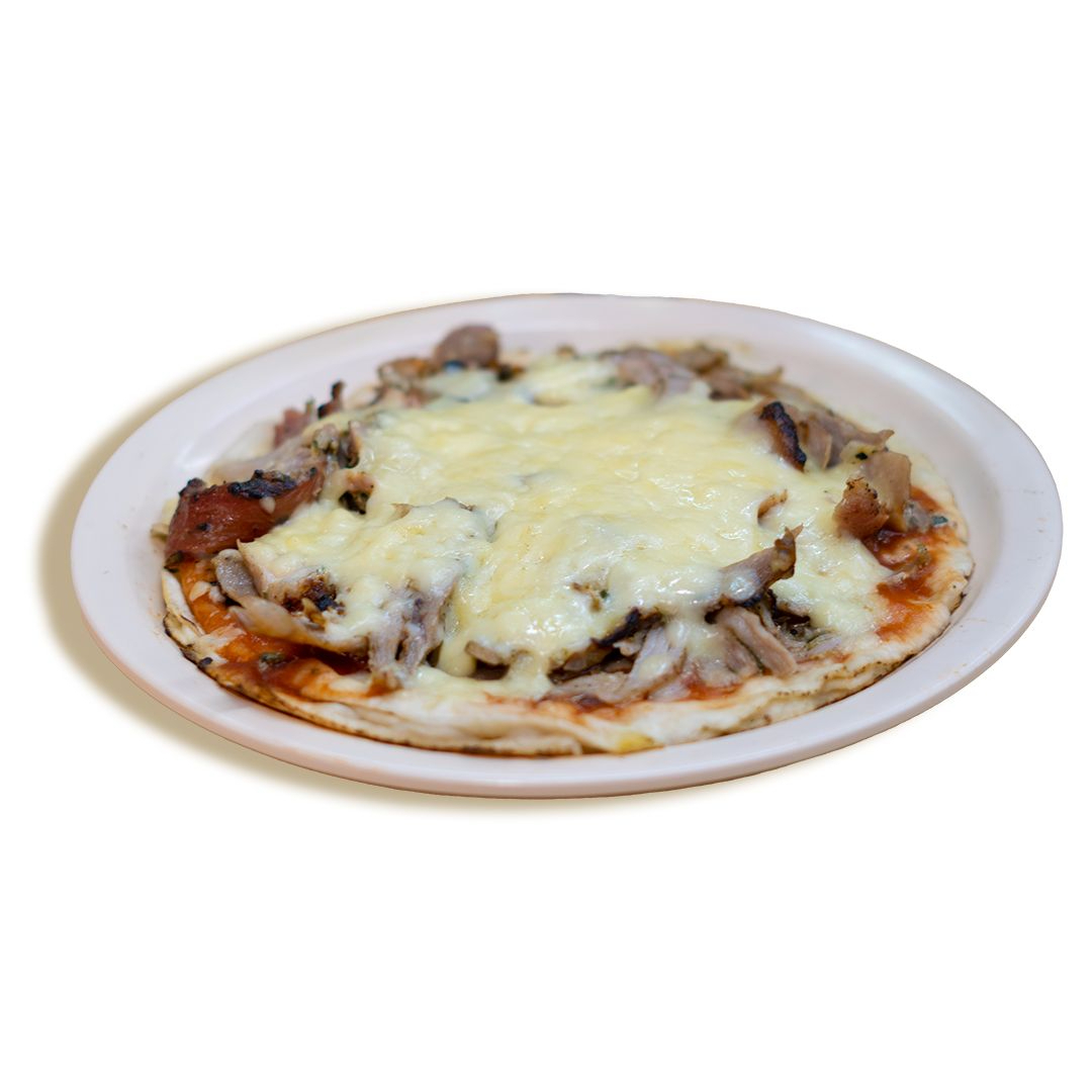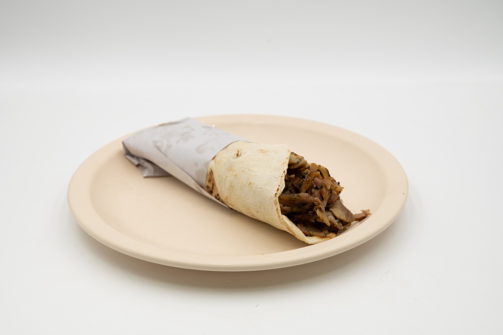 Tortilla de harina rellena de carne árabe con queso, dorada a la plancha.