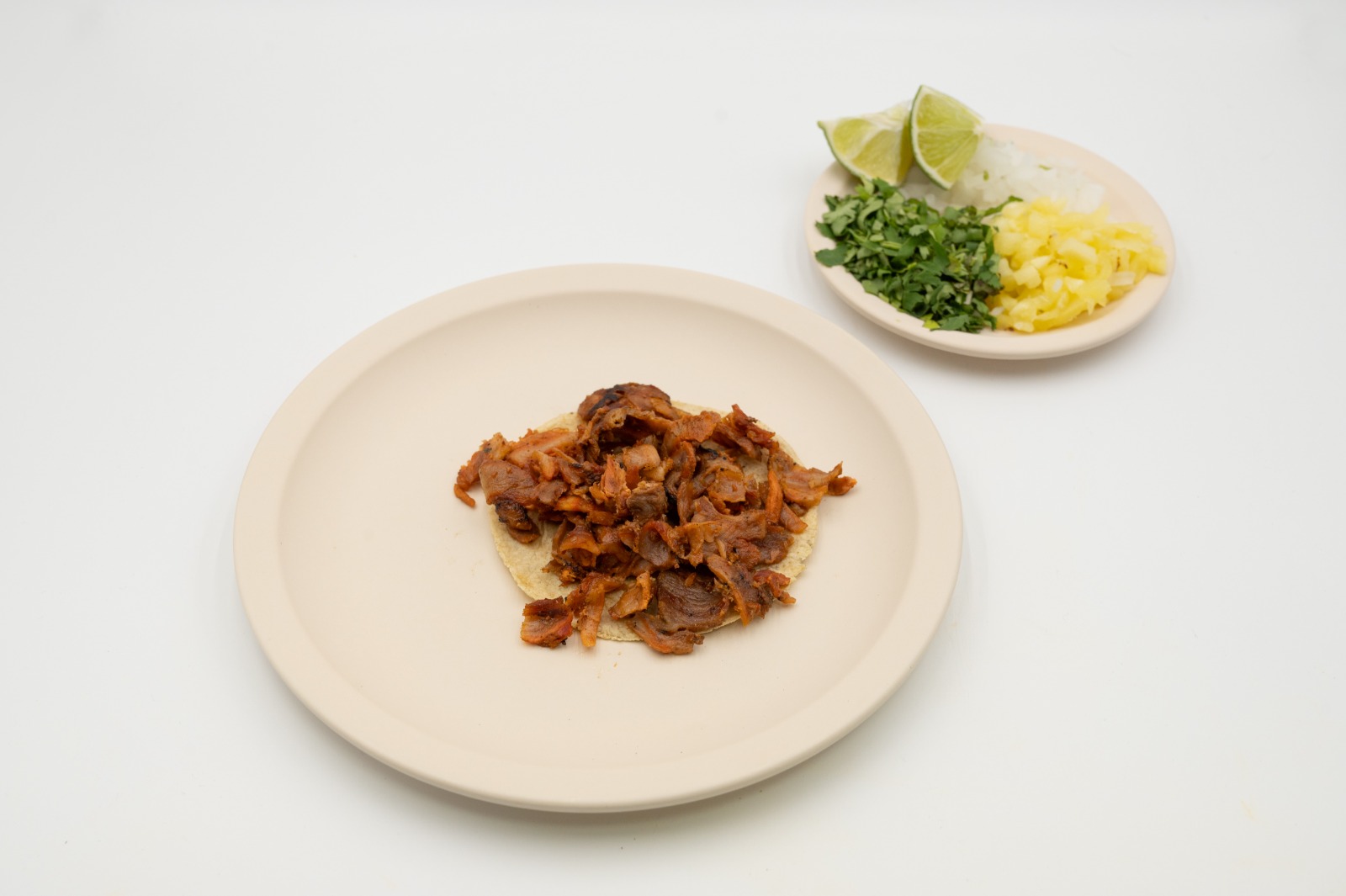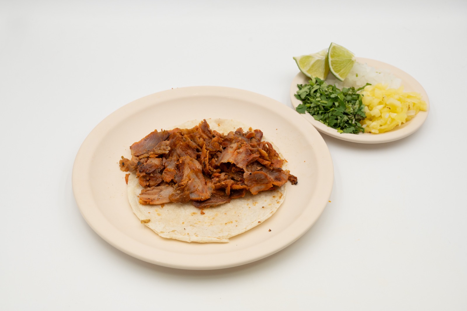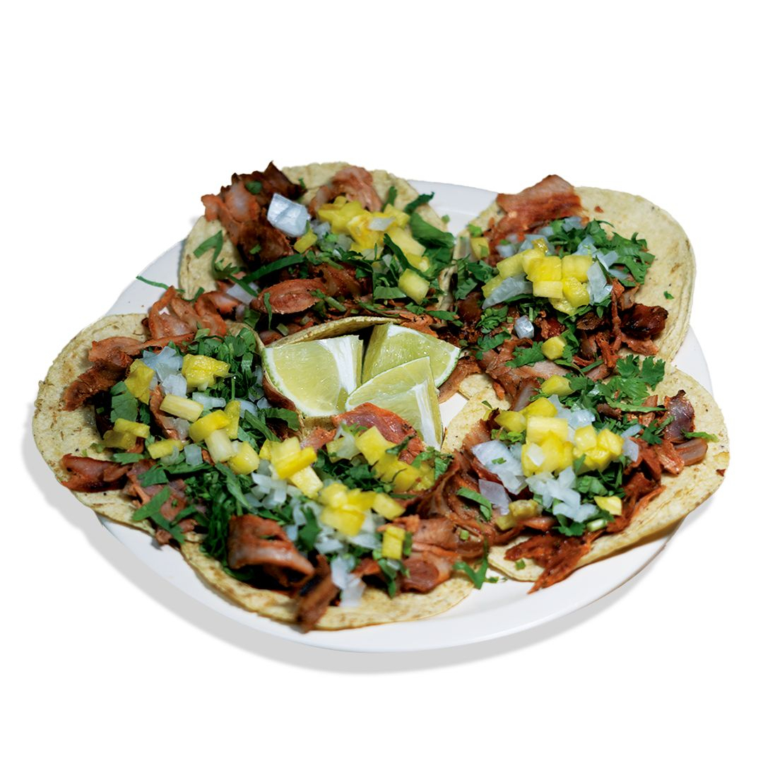 Tortillas de maíz rellenas de carne de cerdo marinada, acompañadas de piña y salsa.
