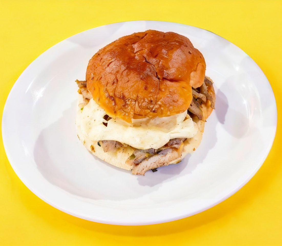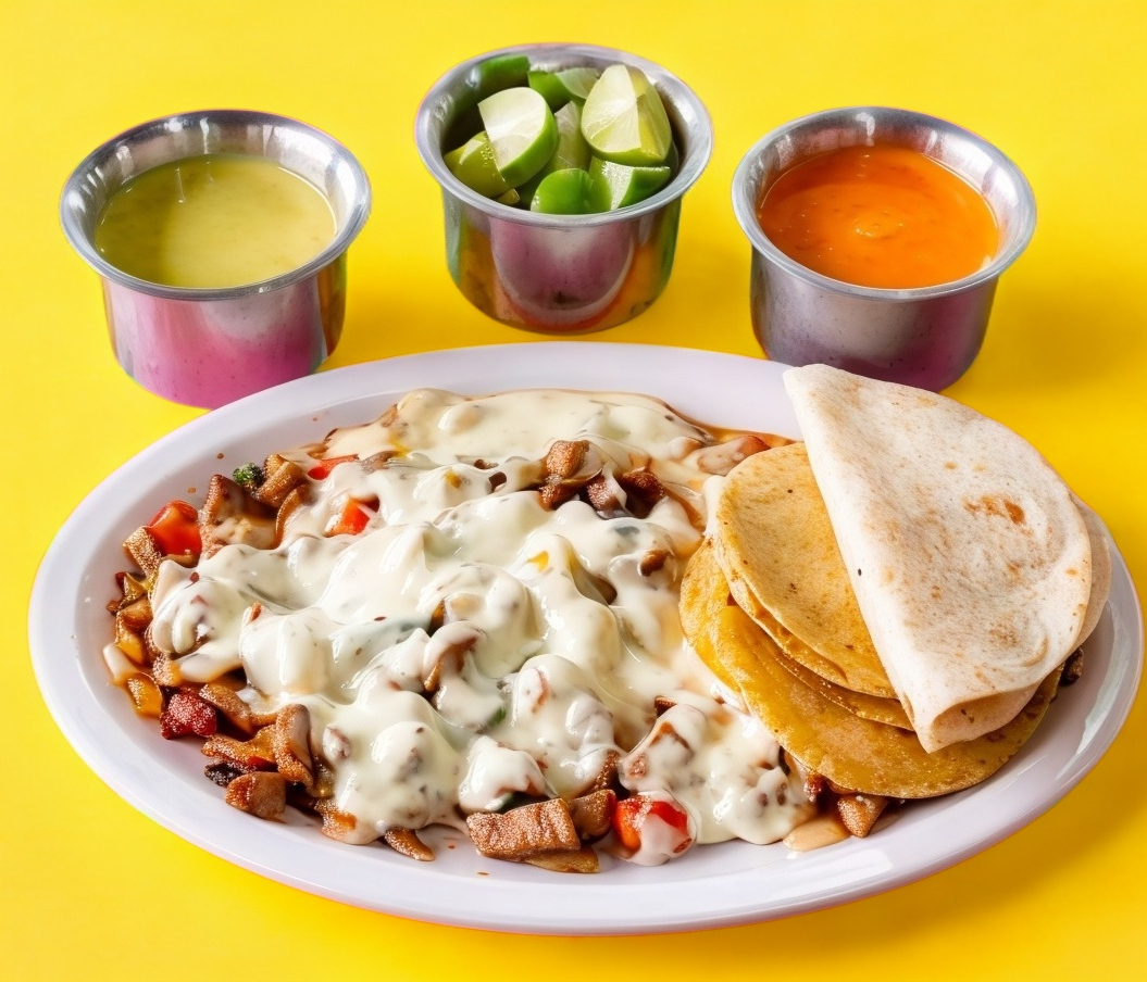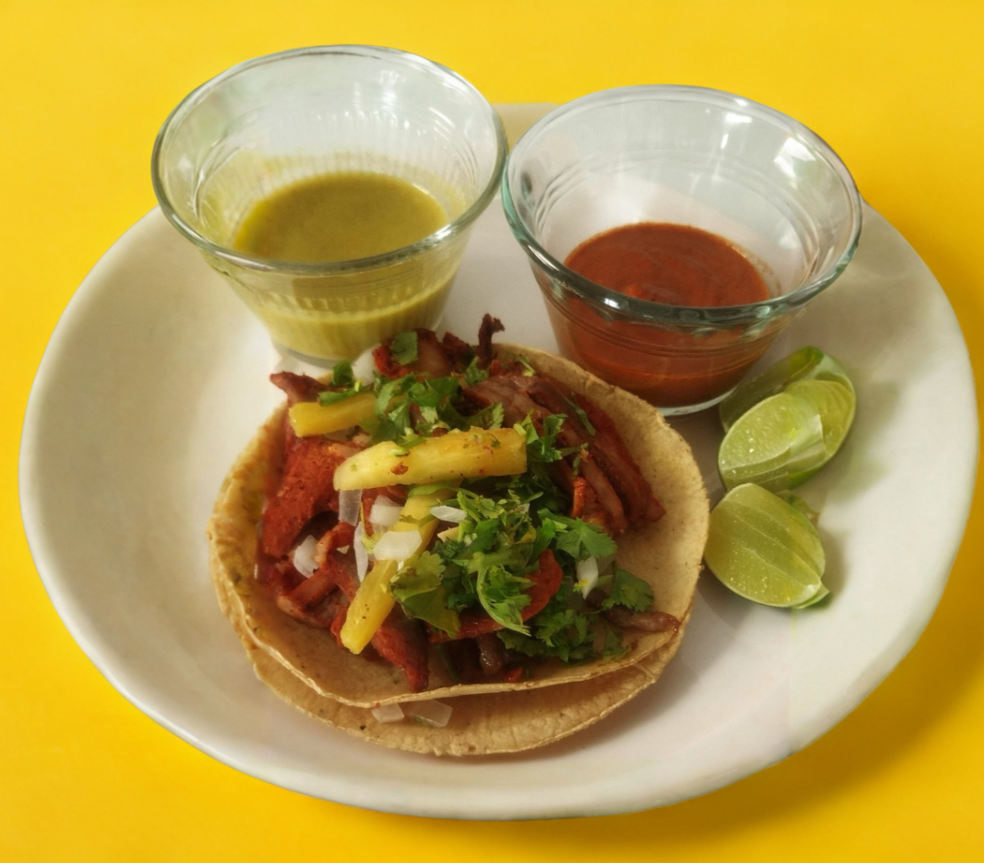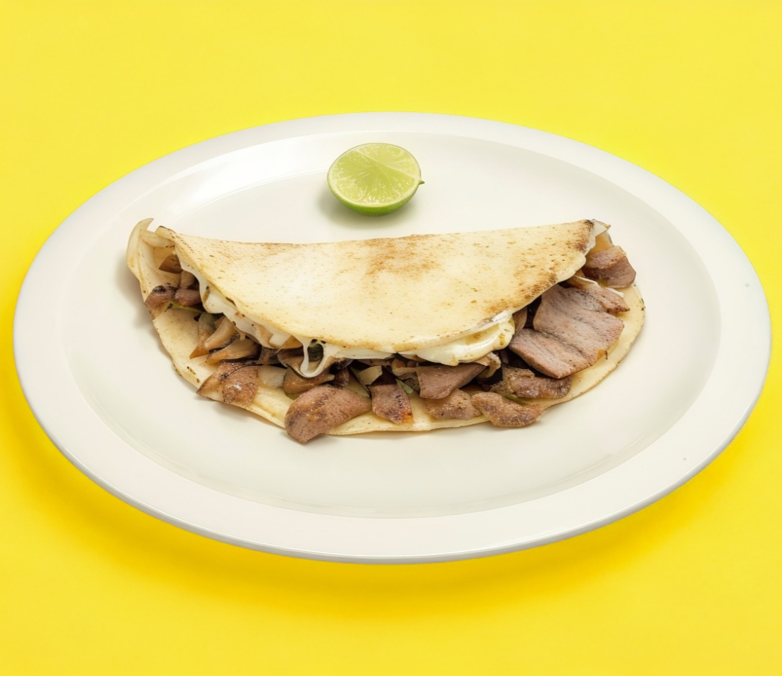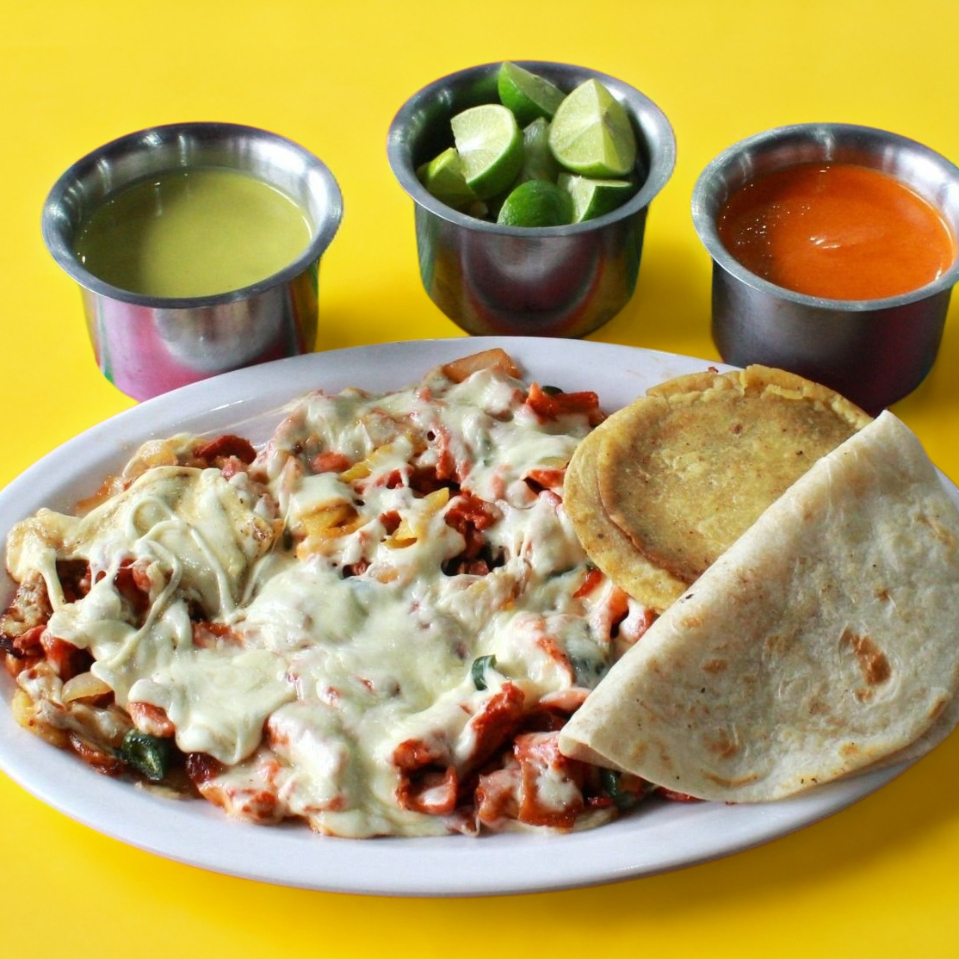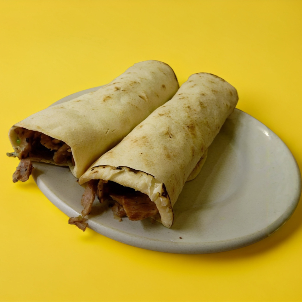 Carne al pastor o árabe, tortilla árabe, quesillo, aguacate.