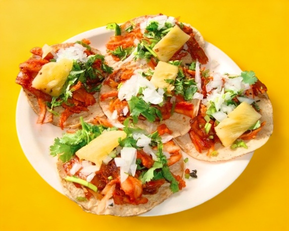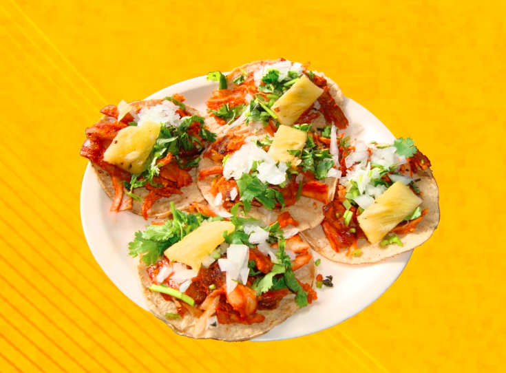 Cinco tacos de carne al pastor en tortilla de maíz.
