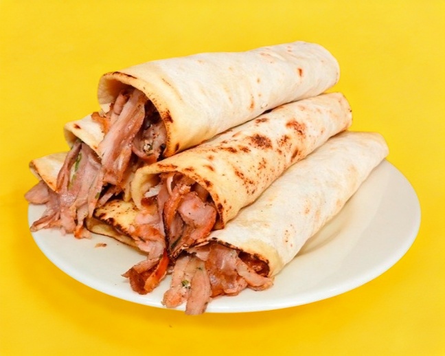 Un taco de carne Árabe en tortilla de pan Árabe.