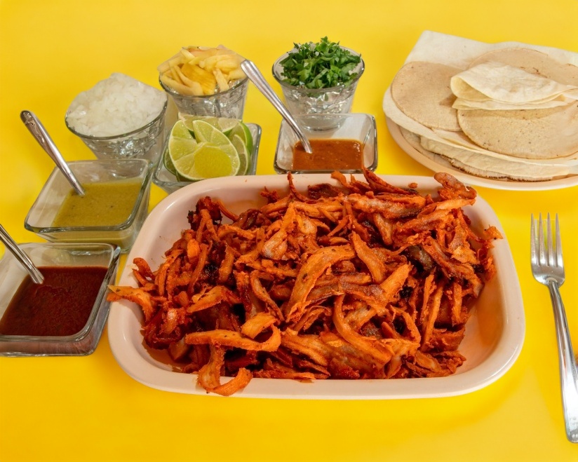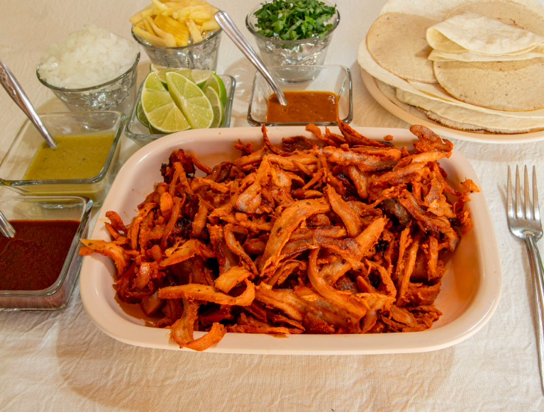 Un kilogramo de carne al pastor. Incluye salsas, verdura, tortillas y pan.