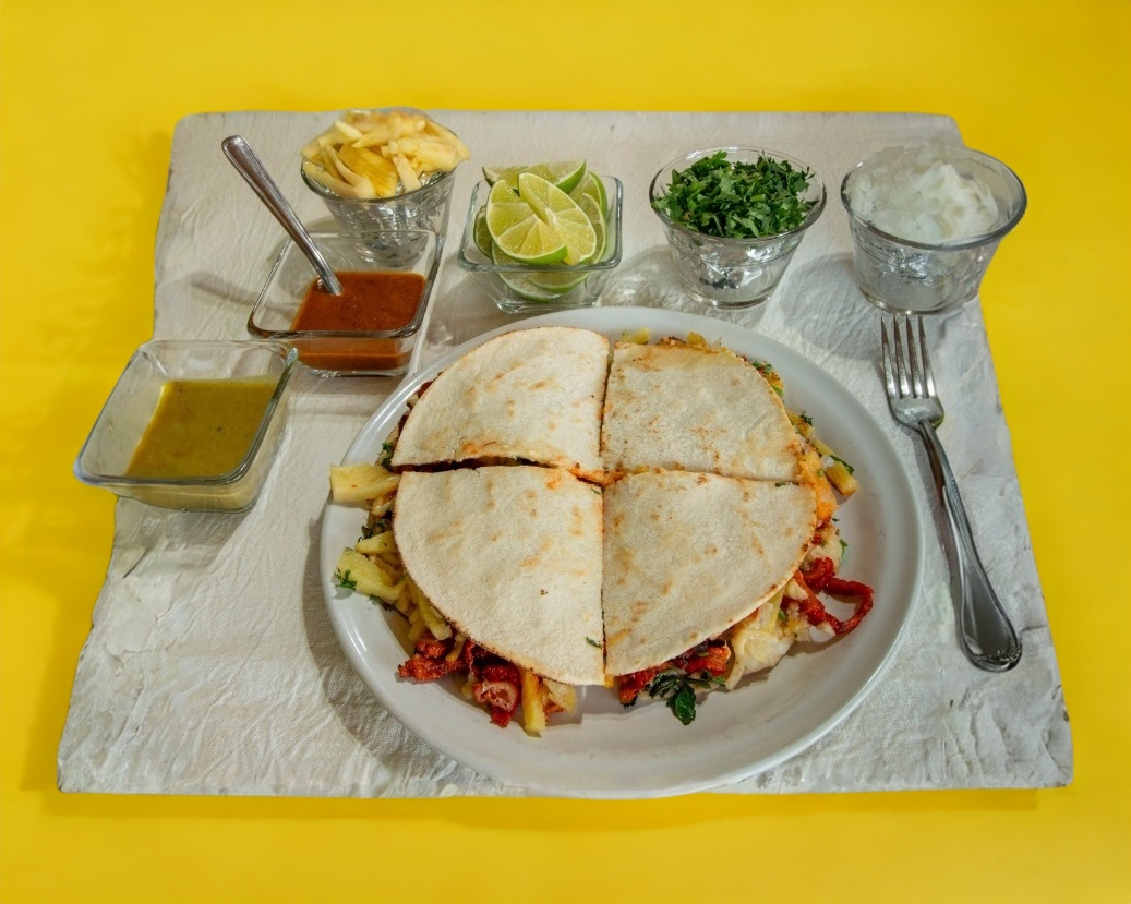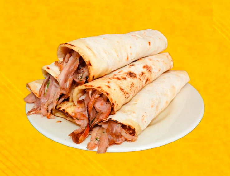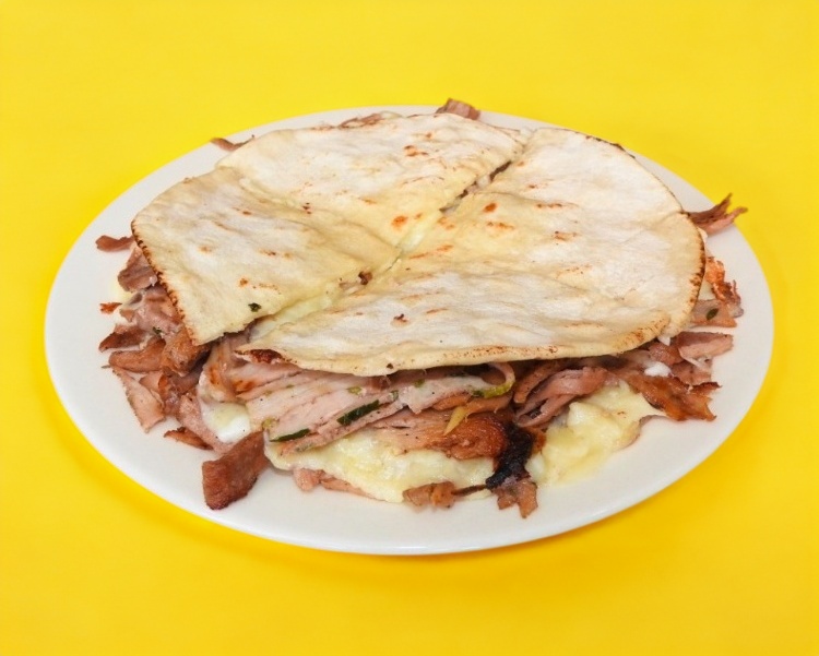 Tortilla de harina rellena de carne al pastor y queso.