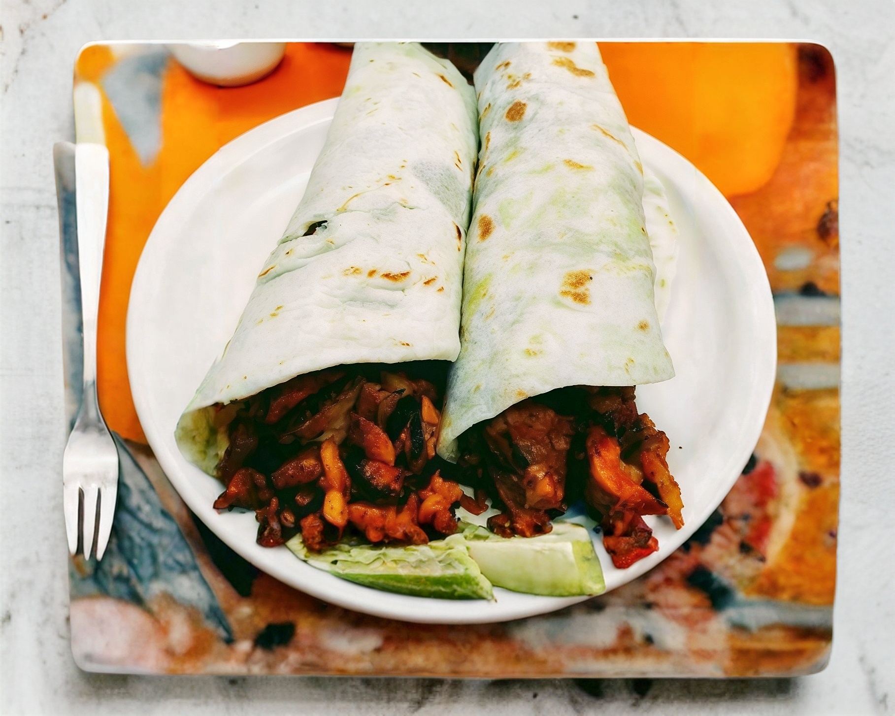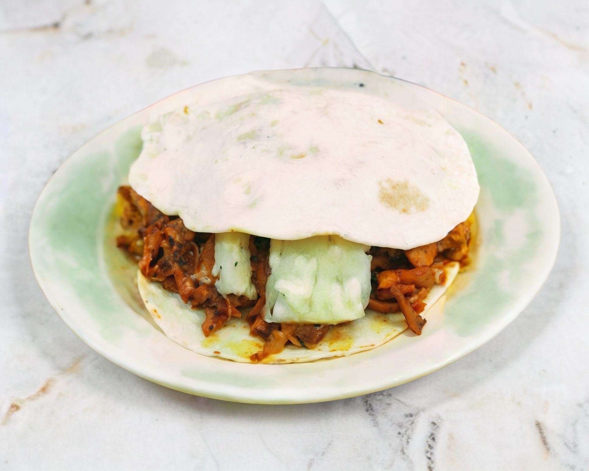 Carne al pastor con queso en medio de 2 tortillas de harina.