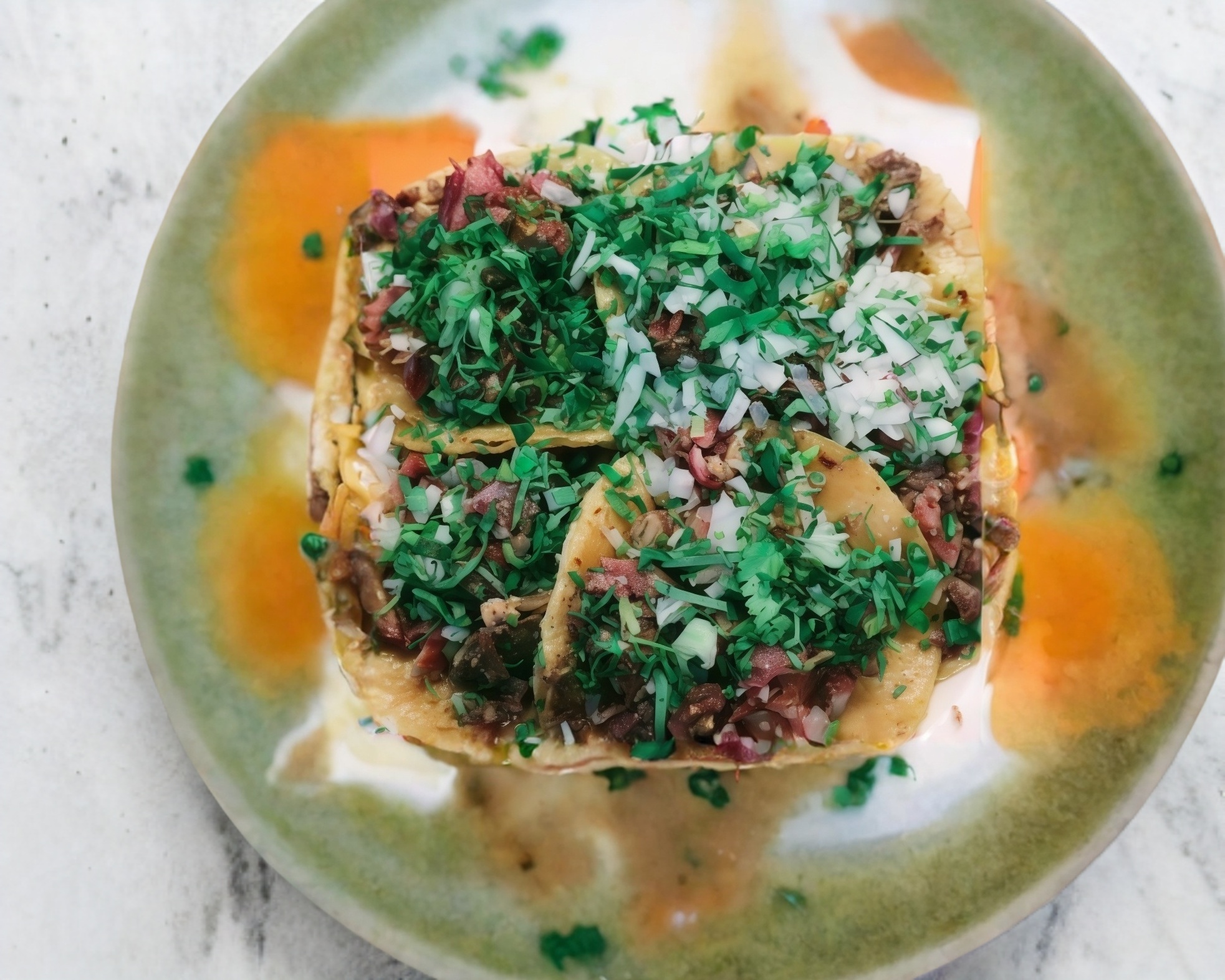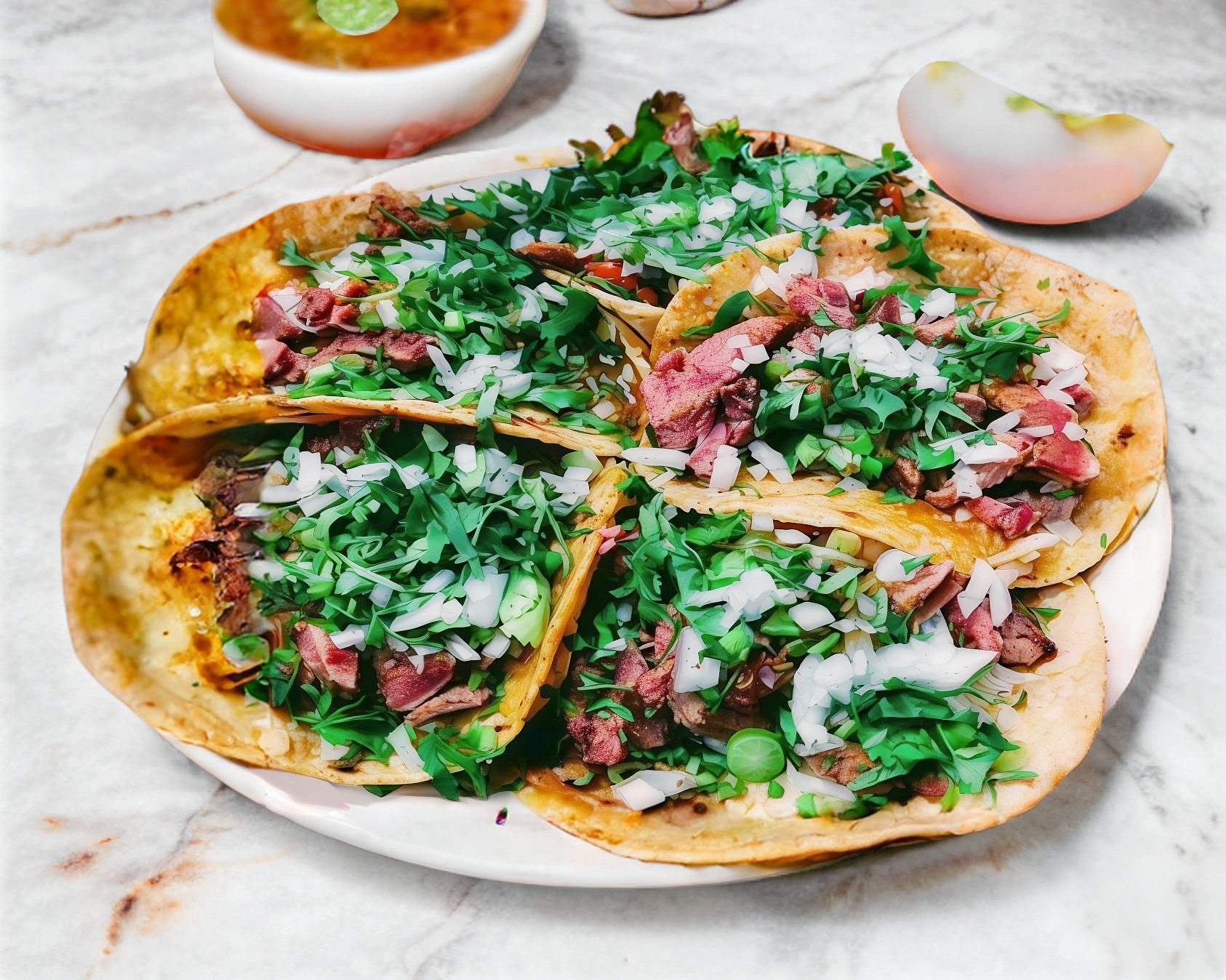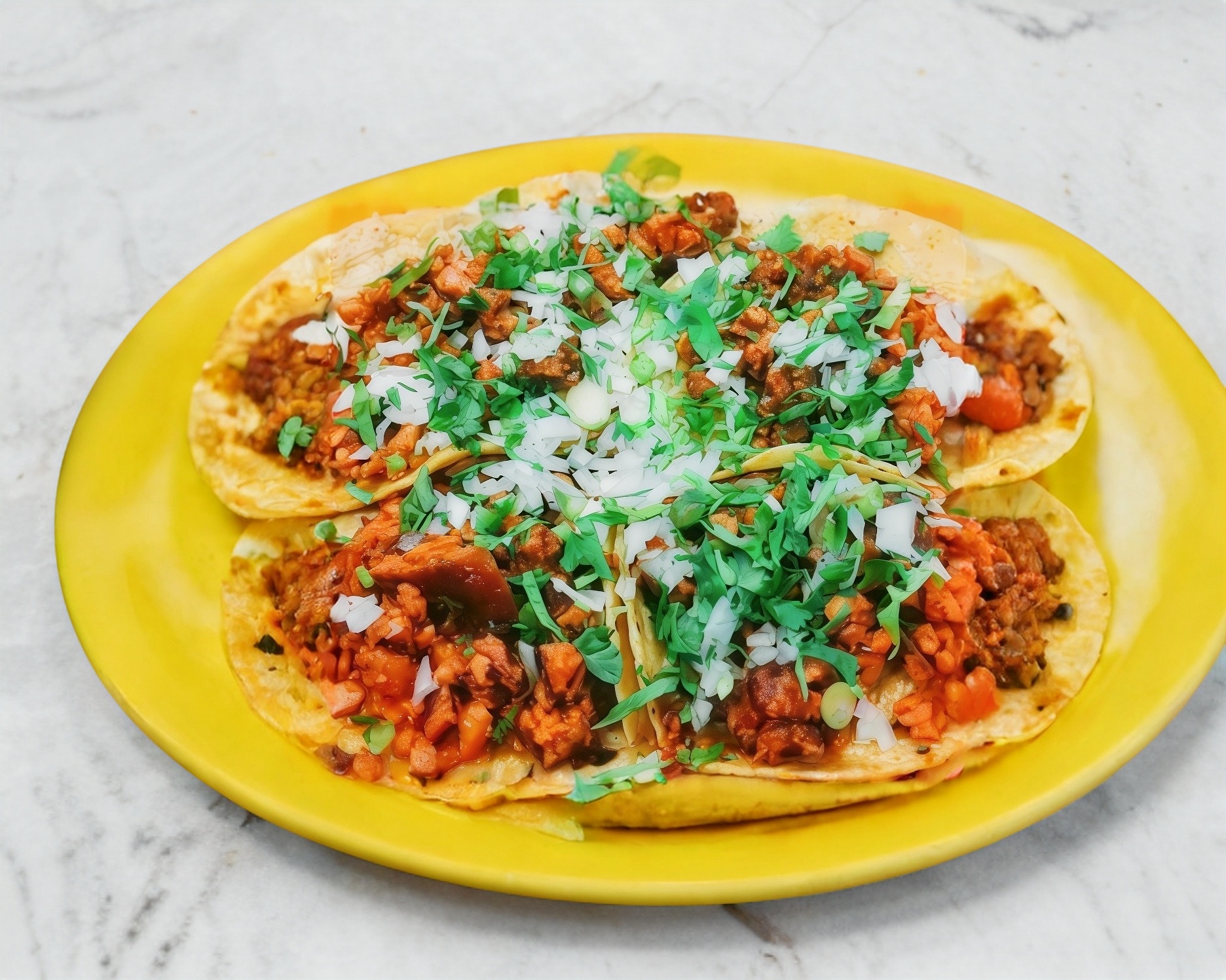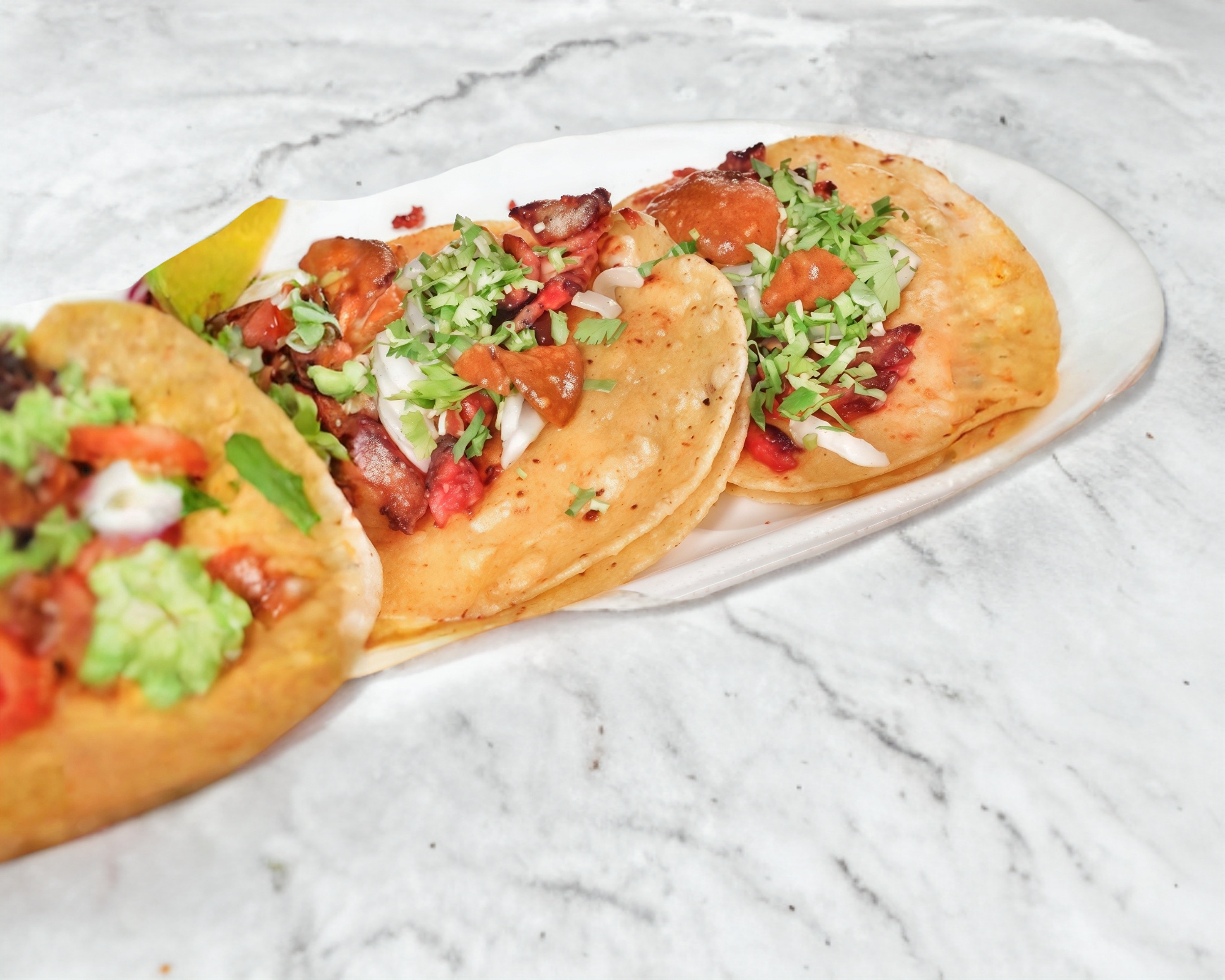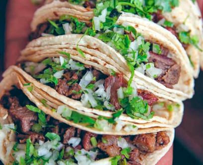 4 Tacos de bistec en doble tortilla de maíz tamaño chalupa.