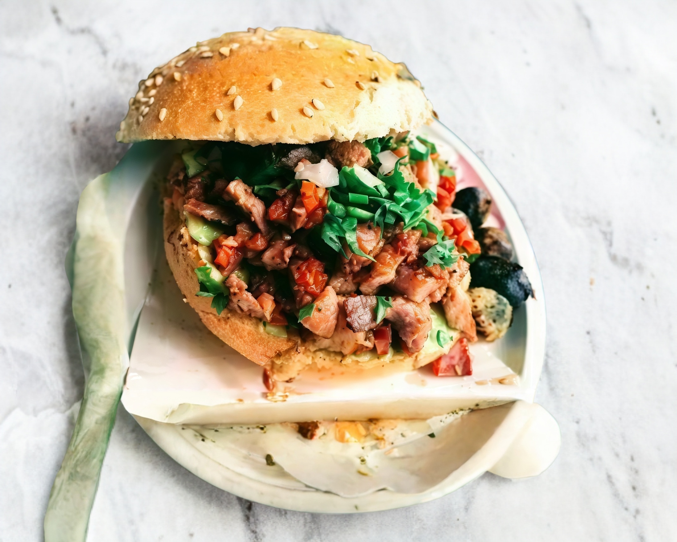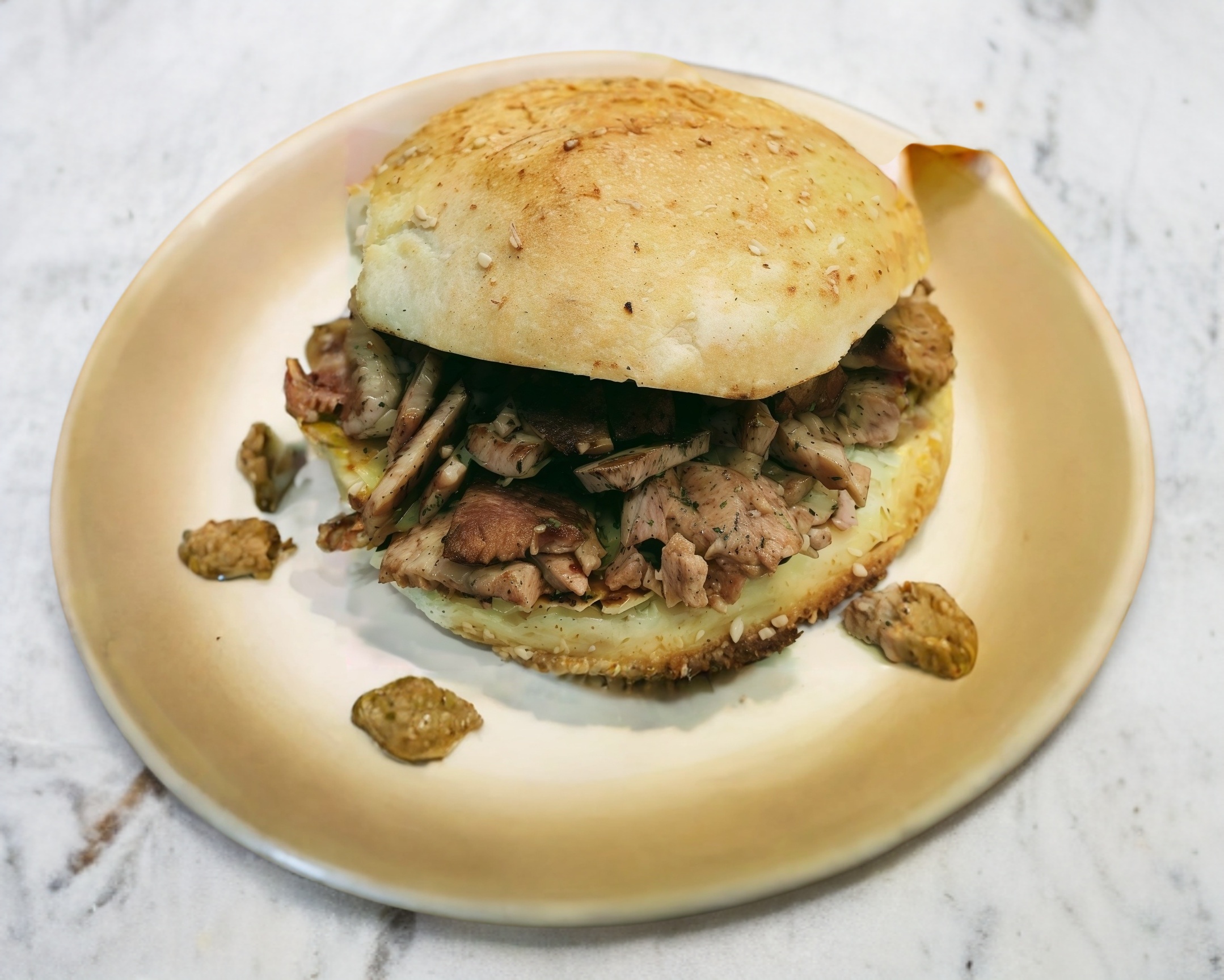 Pan de cemita de 15 cm de diámetro rellena de carne de cabeza de al pastor.