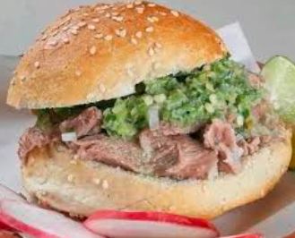 Pan de cemita de 15 cm de diámetro rellena de carne de lengua de res al vapor.