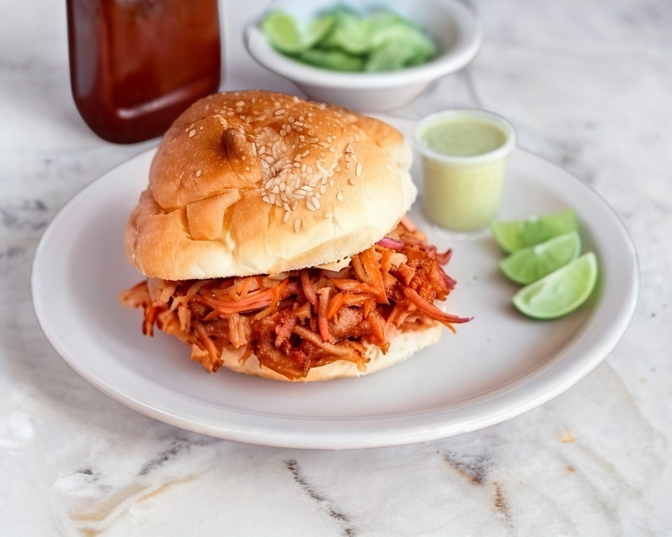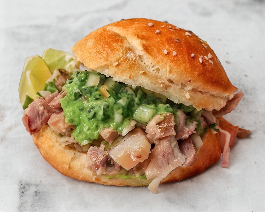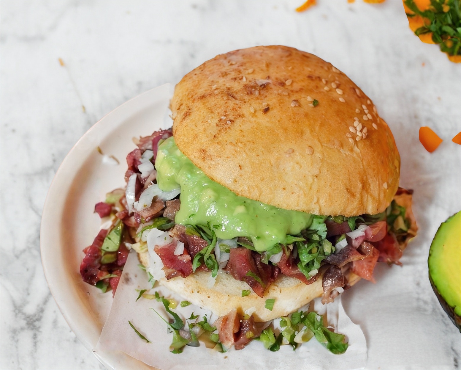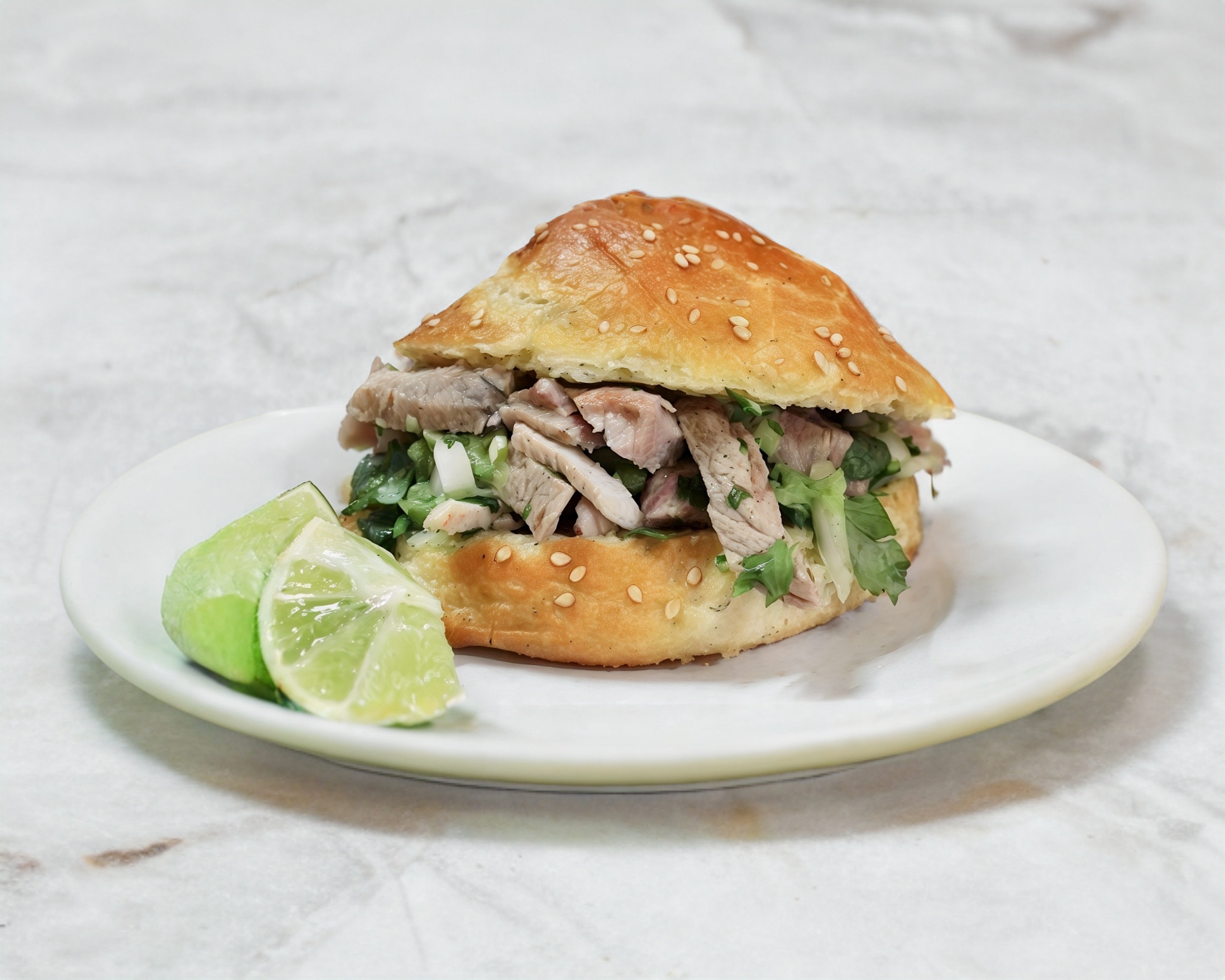 Pan de cemita de 15 cm de diámetro rellena de carne de cachete de res al vapor.