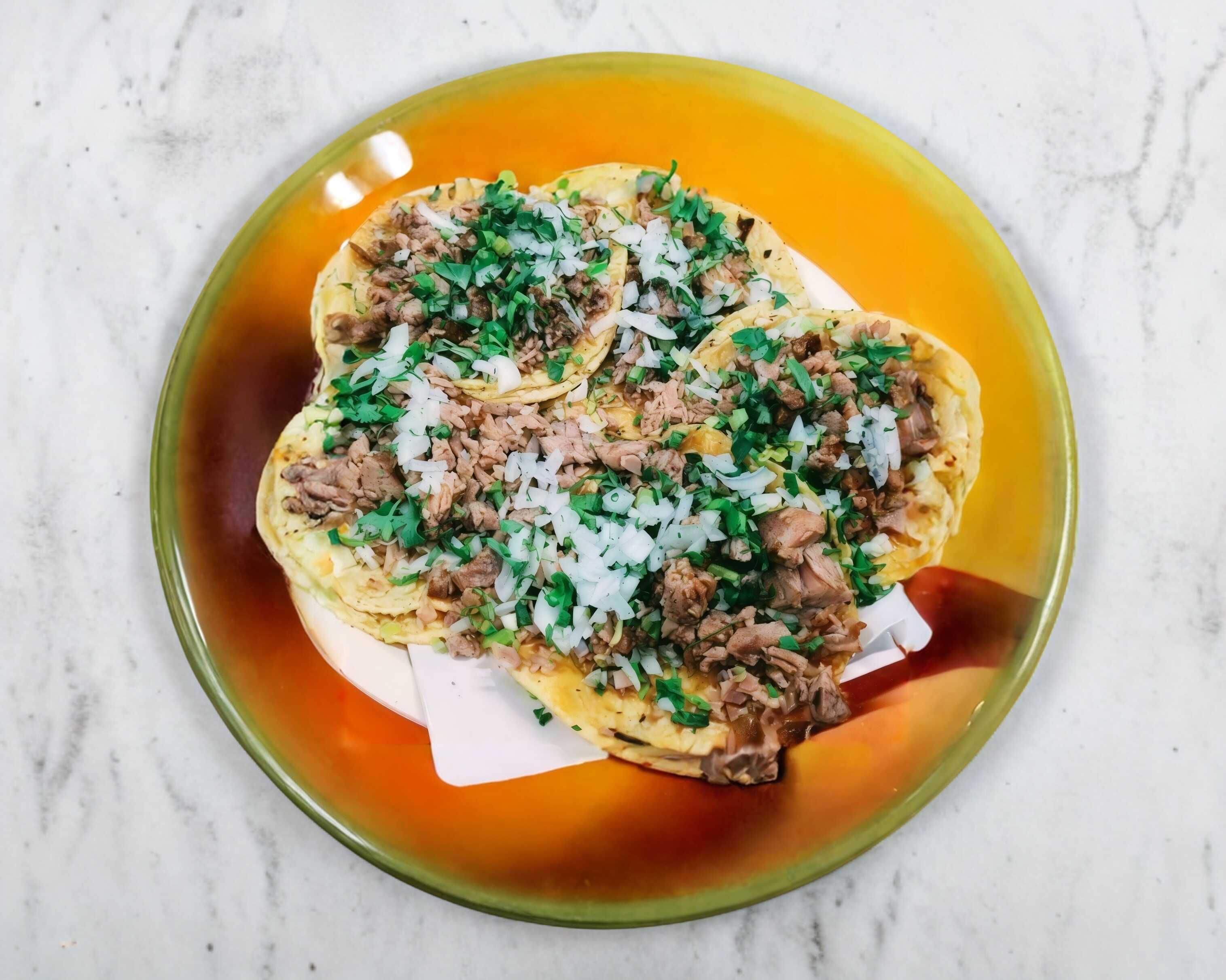1 Taco de cabeza de res al vapor, con doble tortilla de maíz tamaño chalupa.
