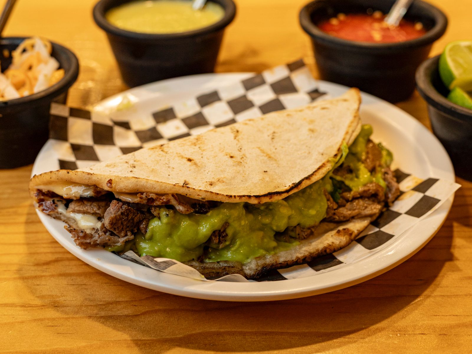 2 Tortillas de harina con queso mozzarella, carne asada y salsa a elegir.