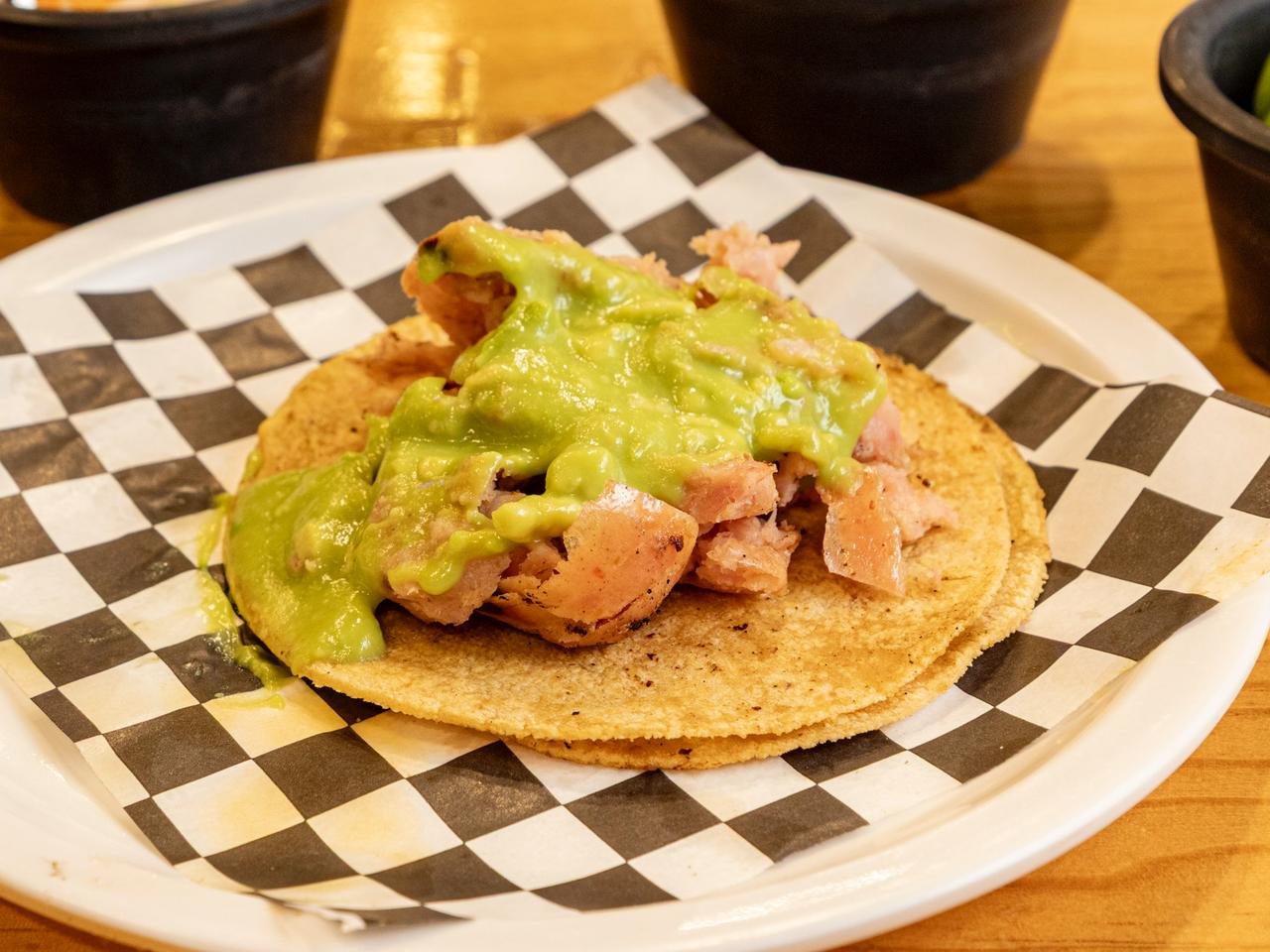 Tortilla de maíz con carne de bistec de puerco 55 g y salsa.