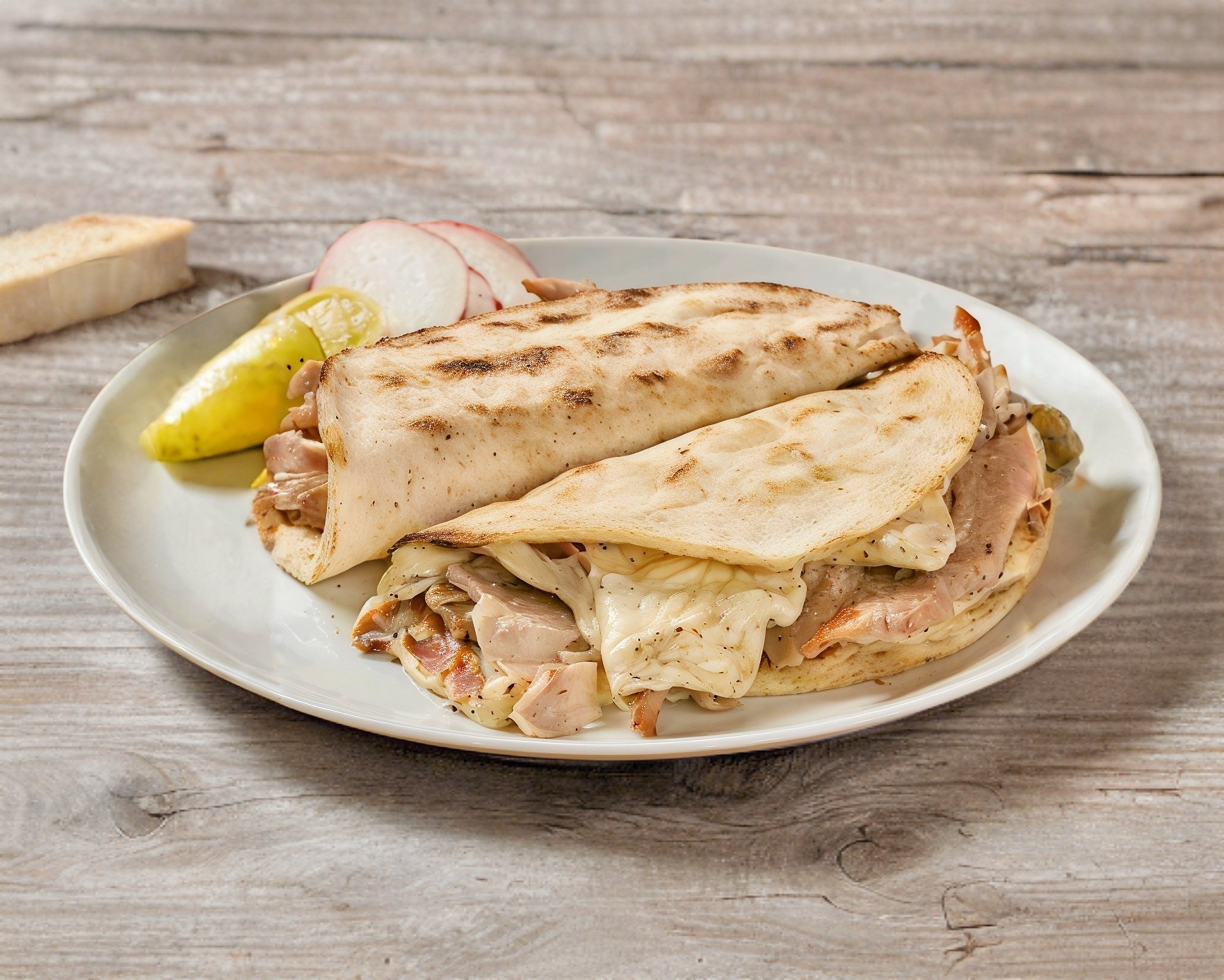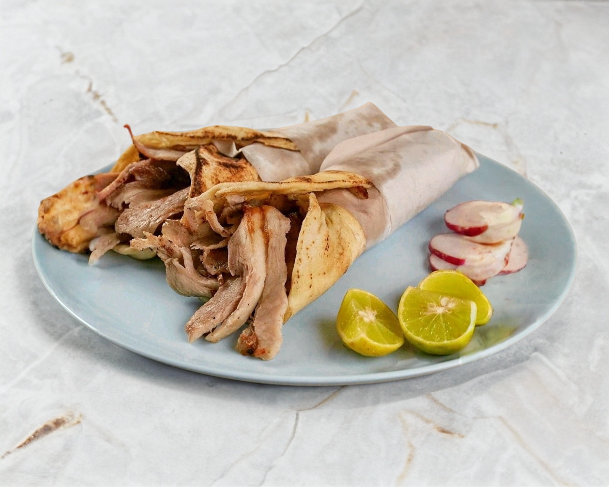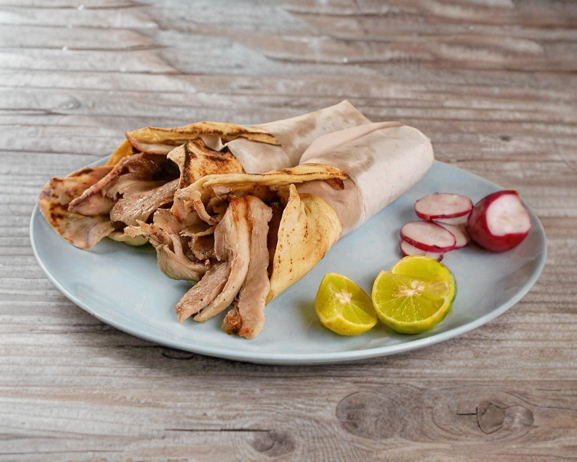 Deliciosa carne árabe con queso fundido y tortilla de harina incluye salsa limón