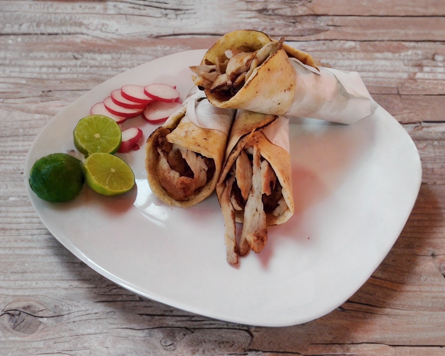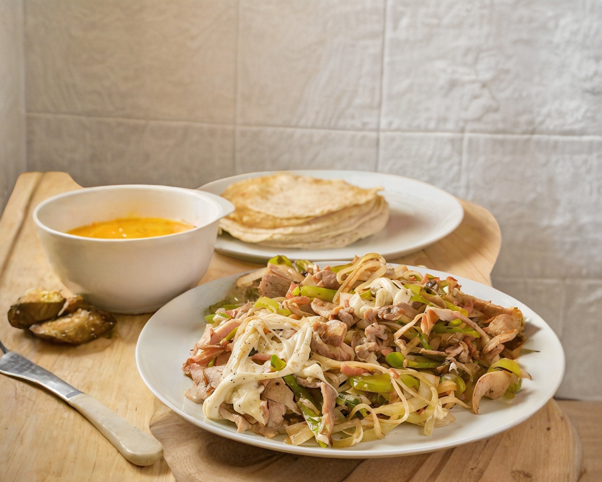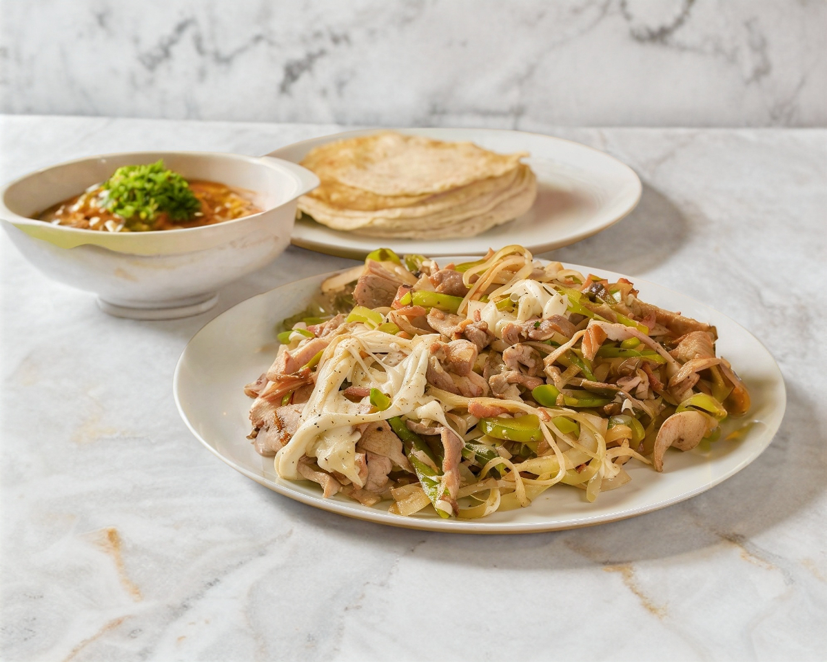 Deliciosa carne árabe con queso fundido y tortilla de harina incluye salsa limón