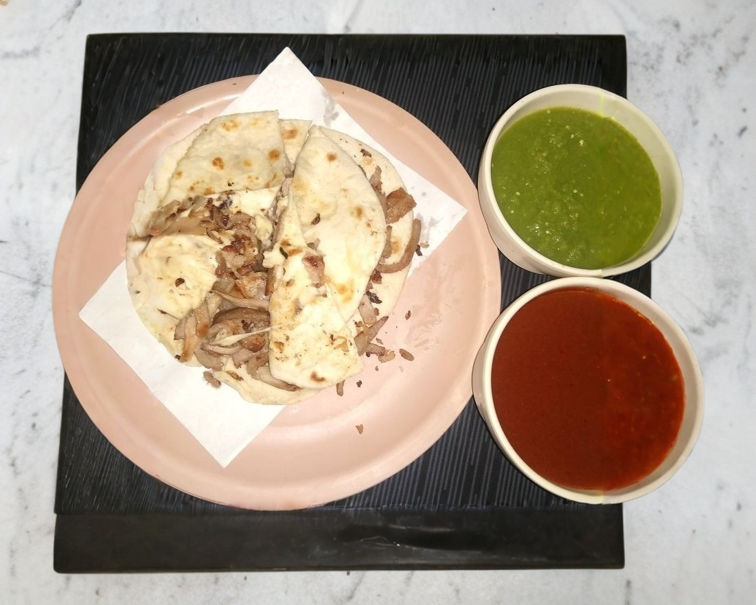 3 piezas, queso, tortilla de harina, jamón, picante.