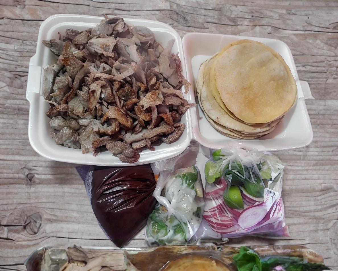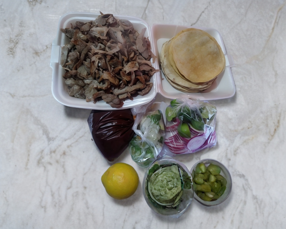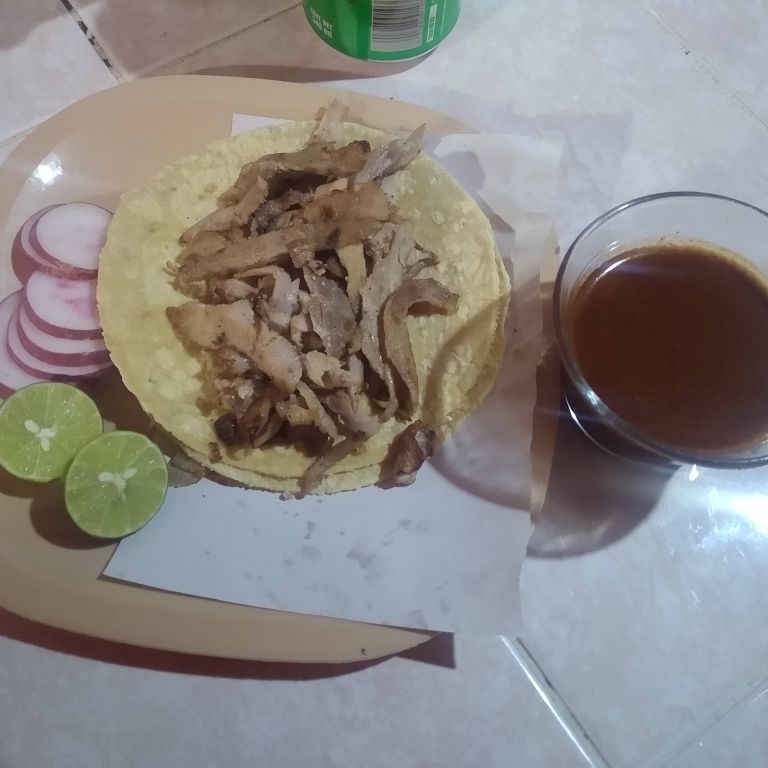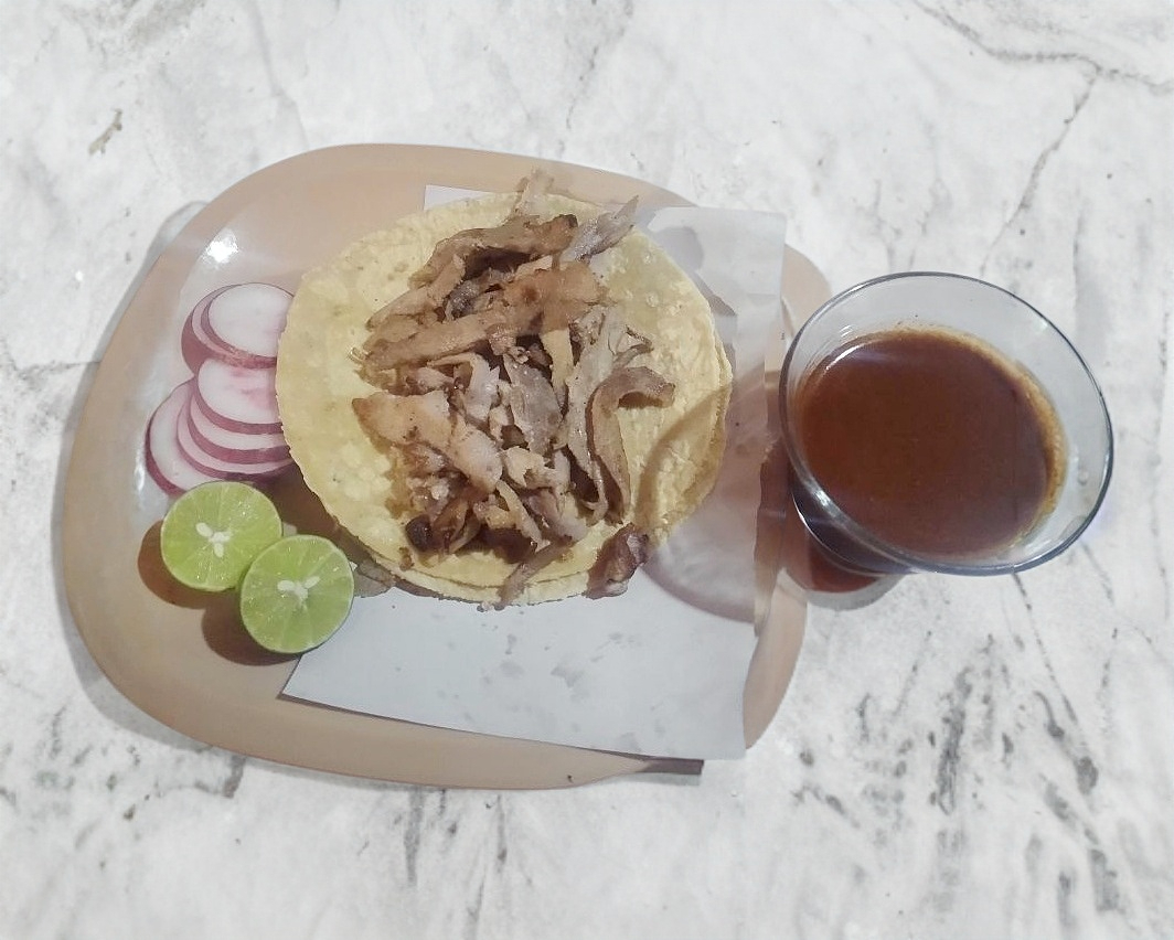 Carne, queso, pimiento, cebolla, tocino, champiñón, salsa, tortilla,limón y habaneros.