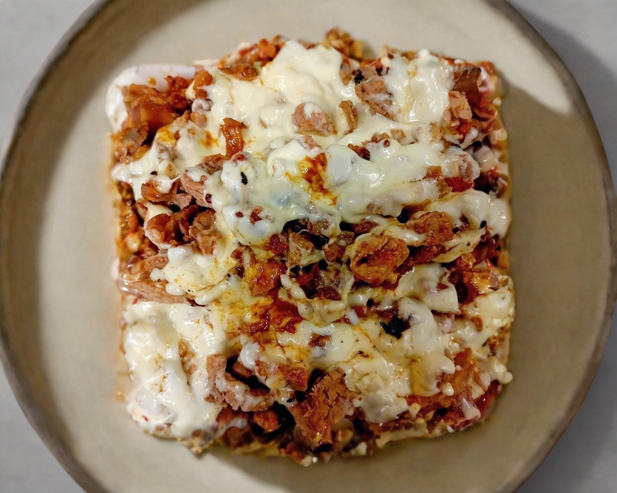 2 Tortillas de pan árabe con salsa italiana, queso manchego y carne árabe o pastor.
