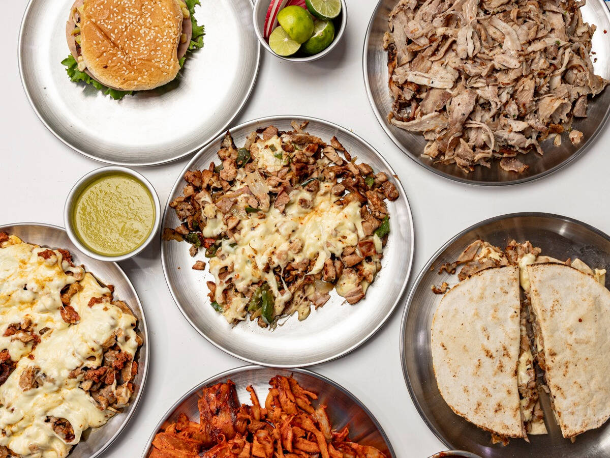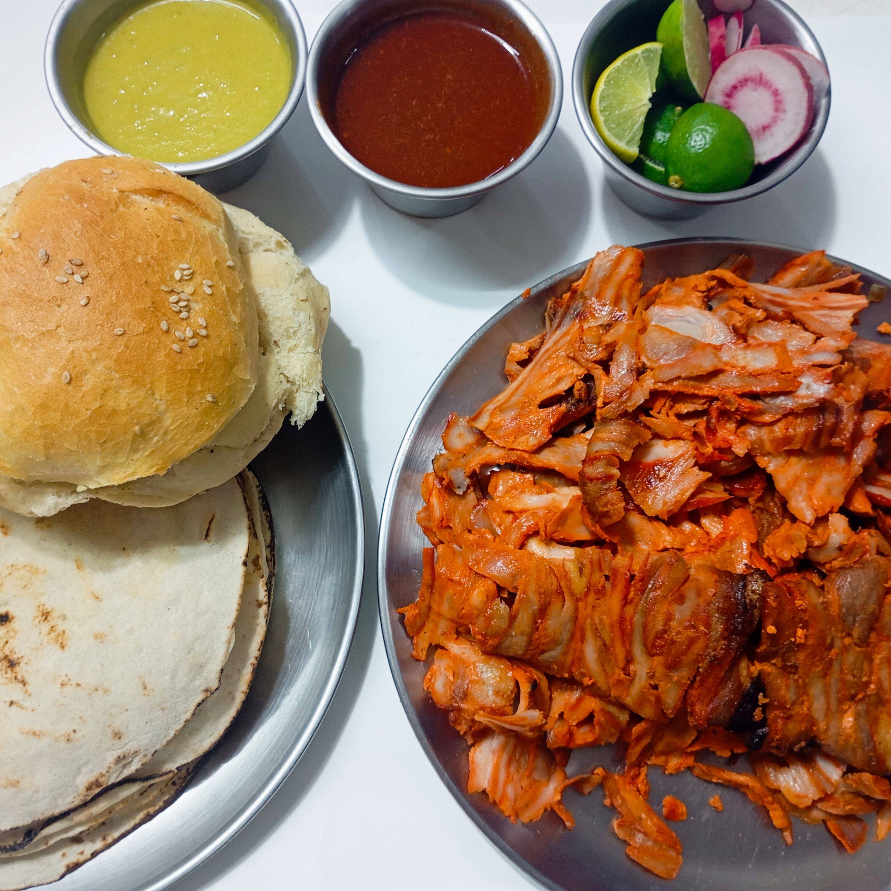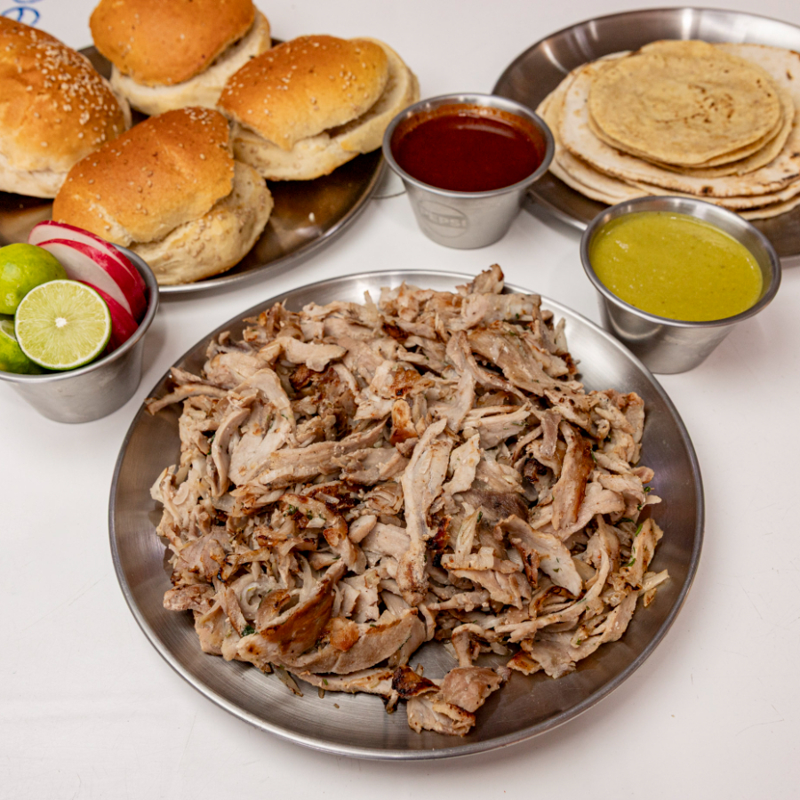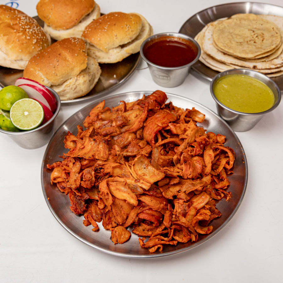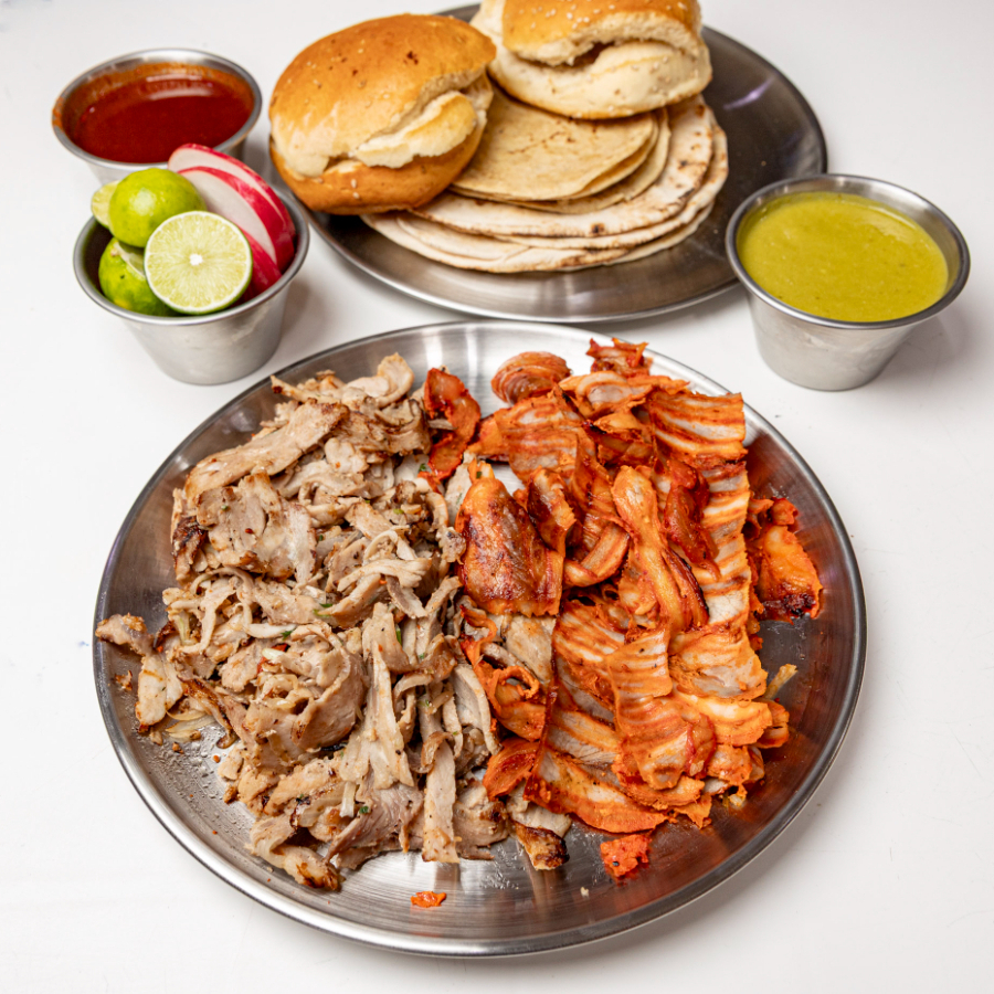 1 kg Pastor, 10 tortillas árabe, 10 tortillas de maíz, 4 cemitas, salsa, limones.