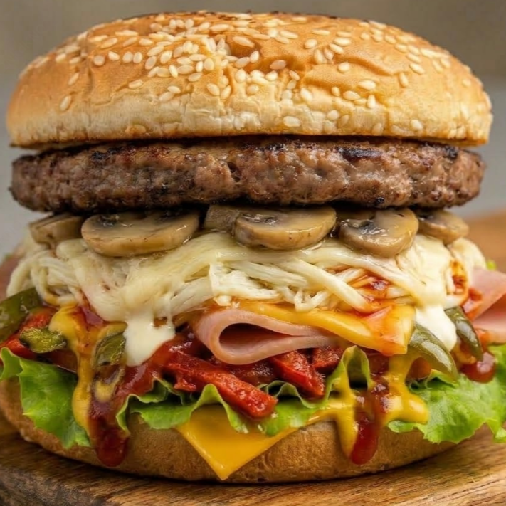 Carne de Res champiñones y queso, jamón, catsup, lechuga,