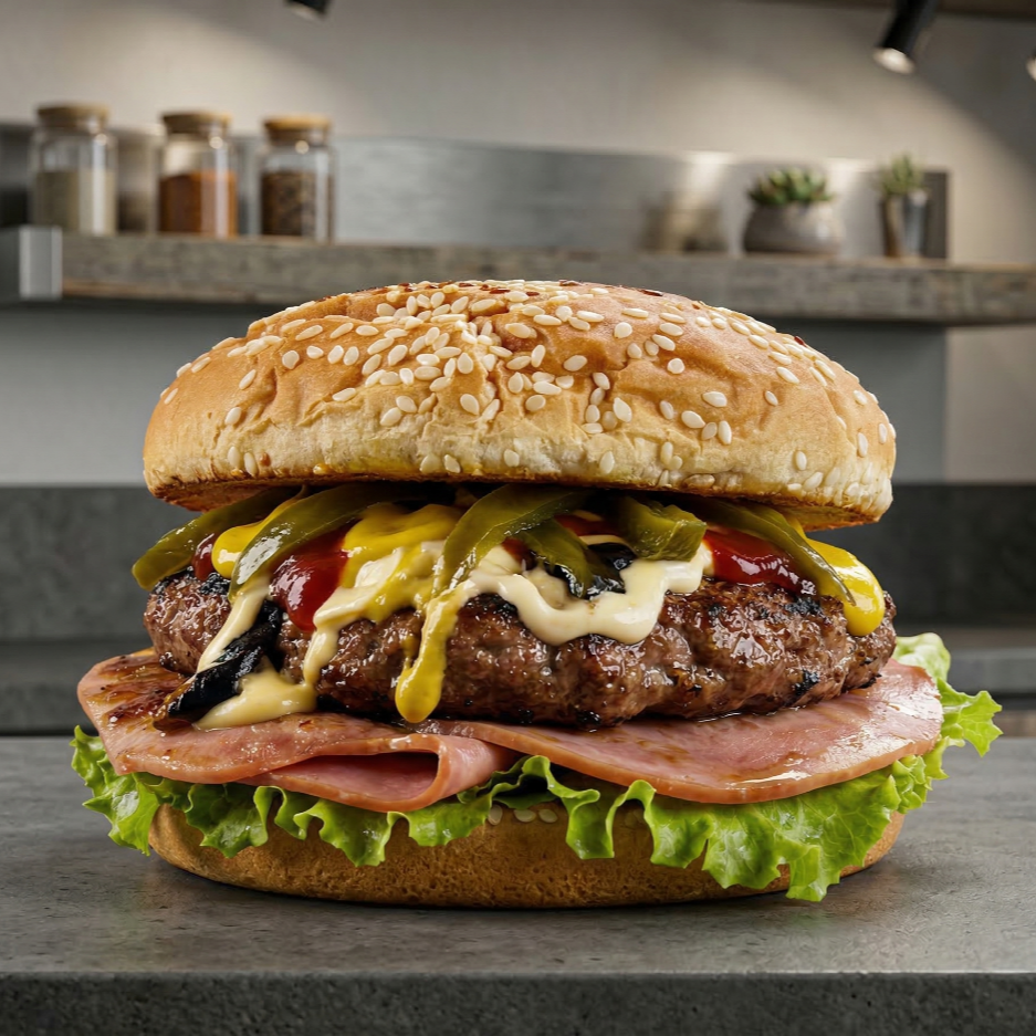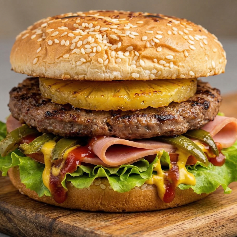 Carne de Res Jamón Lechuga, catsup, queso, piña.