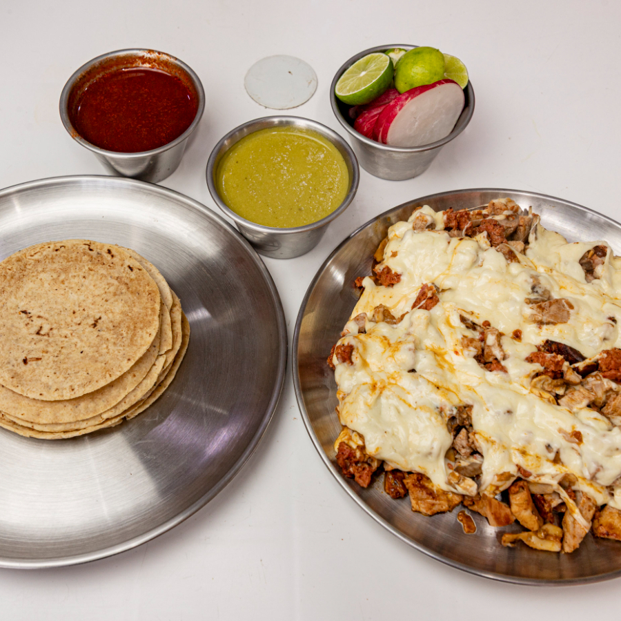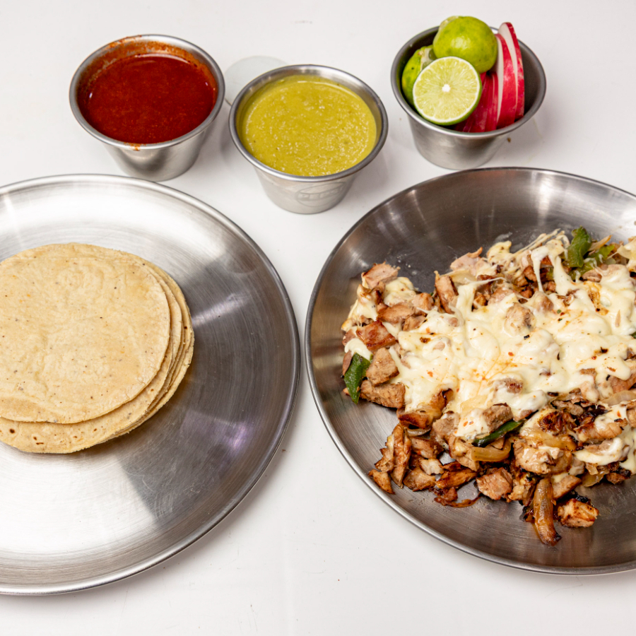Bistec de puerco, cebolla, pimiento verde, tocino, queso, 40 tortillas de maíz, salsa y limones.