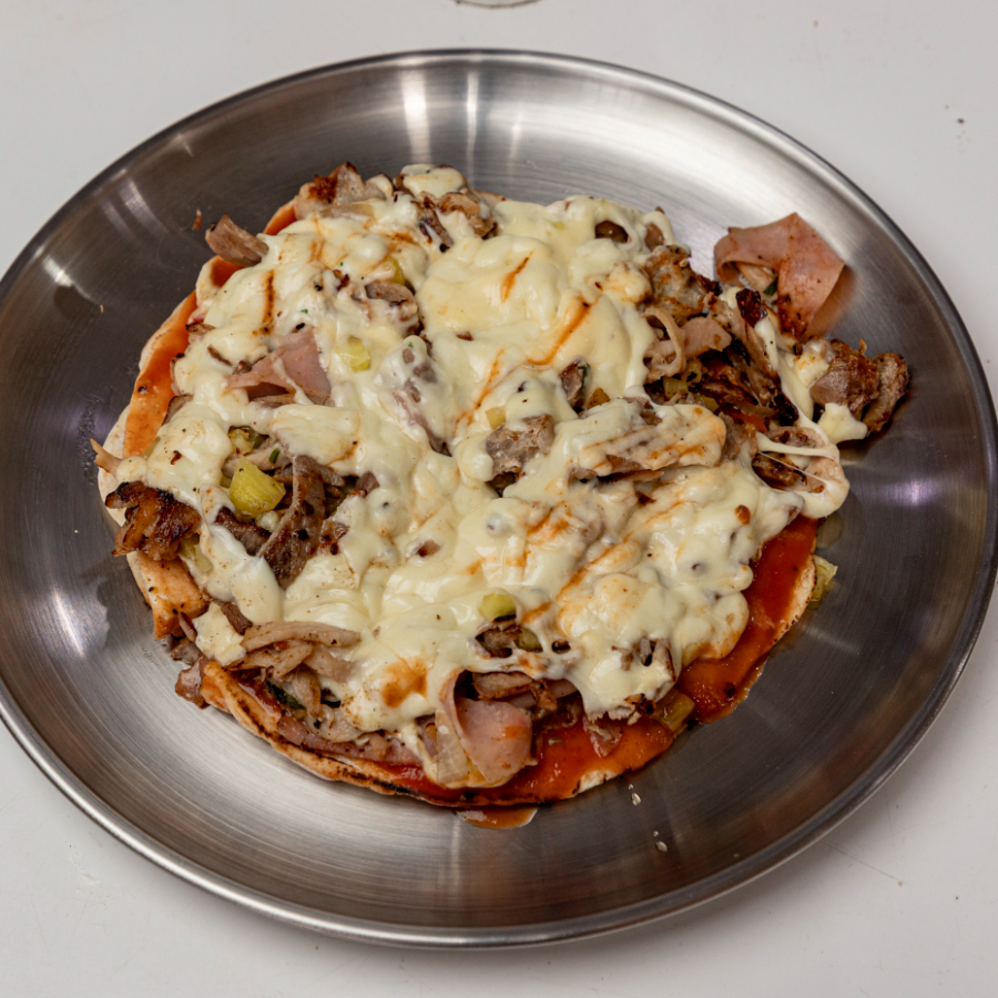 2 Tortillas de pan árabe con salsa italiana, queso, jamón, piña y carne árabe.