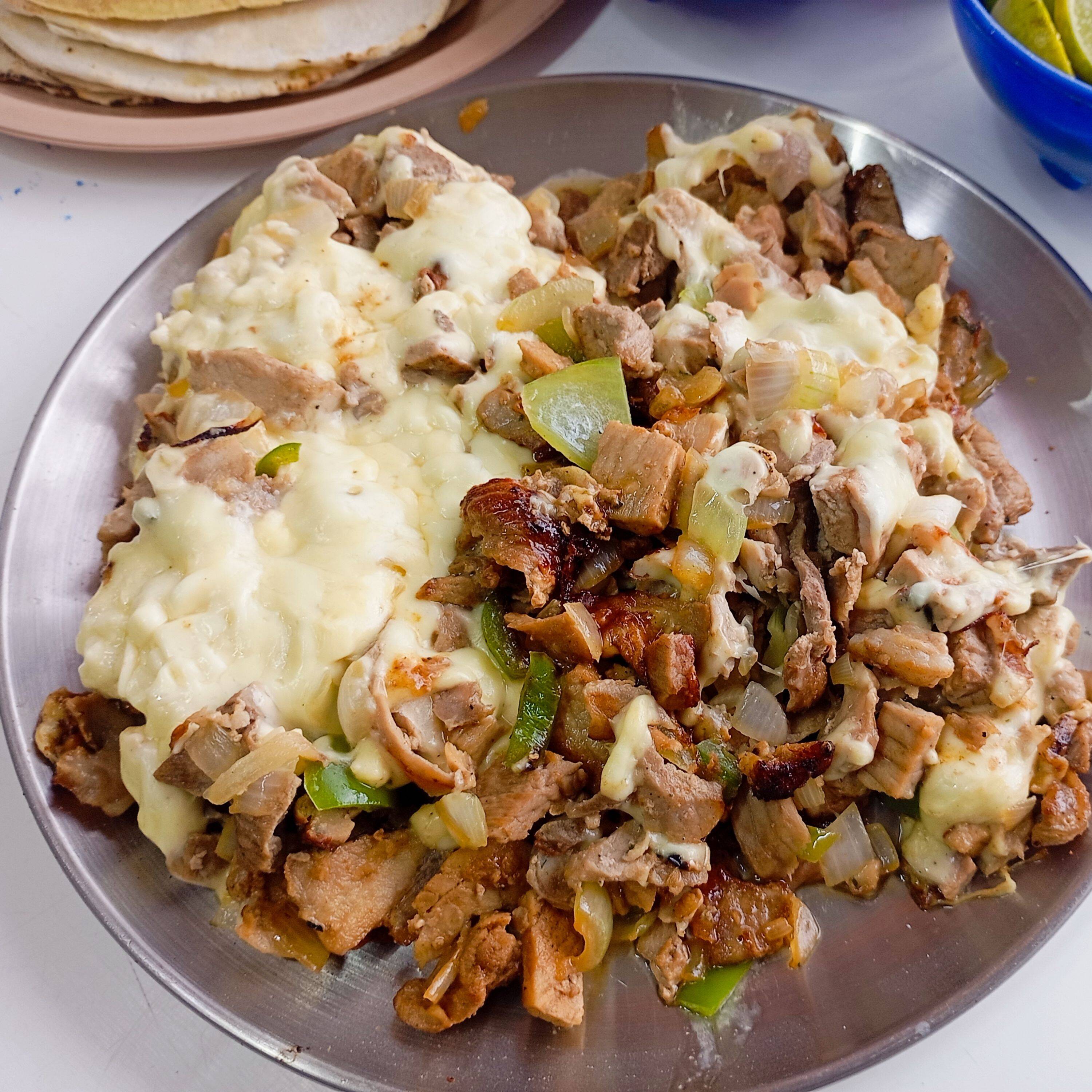 Bistec de puerco tortilla de maíz y Queso