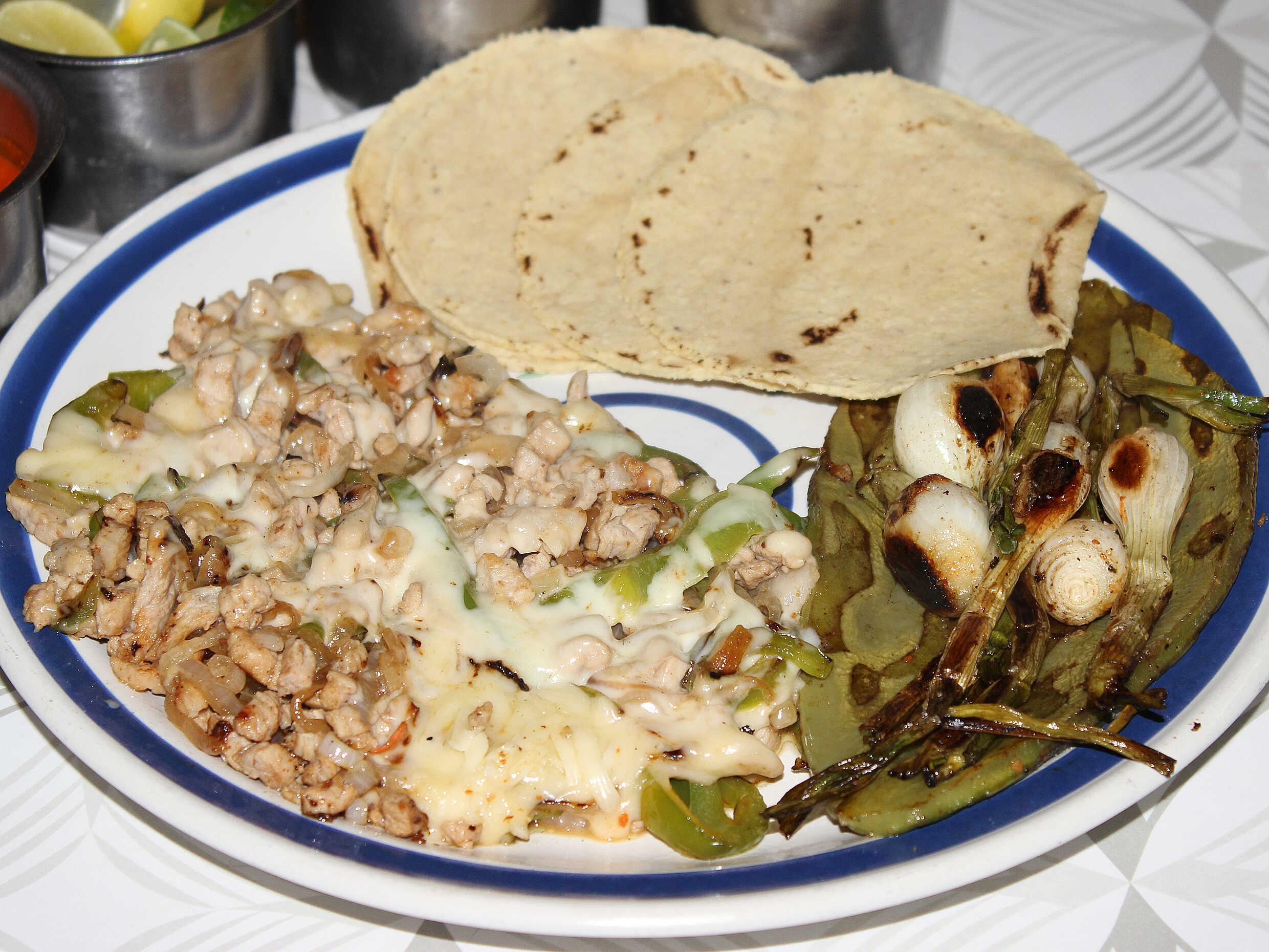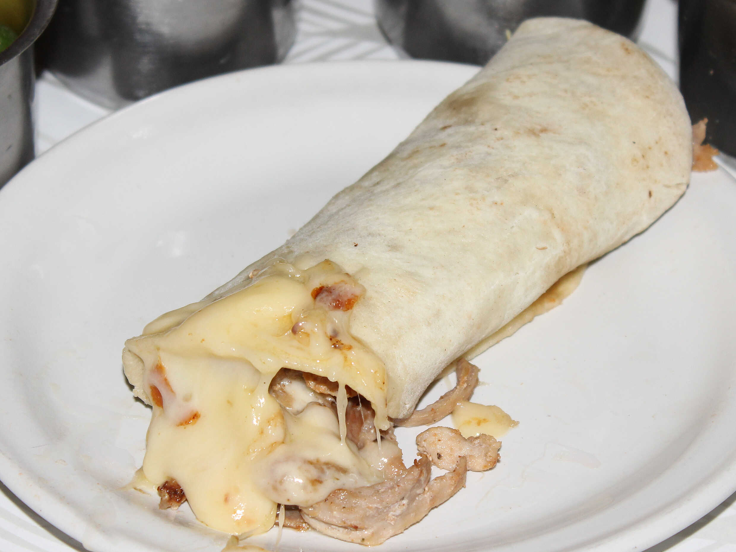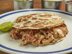 Chuleta, tocino, queso y tortilla de harina.