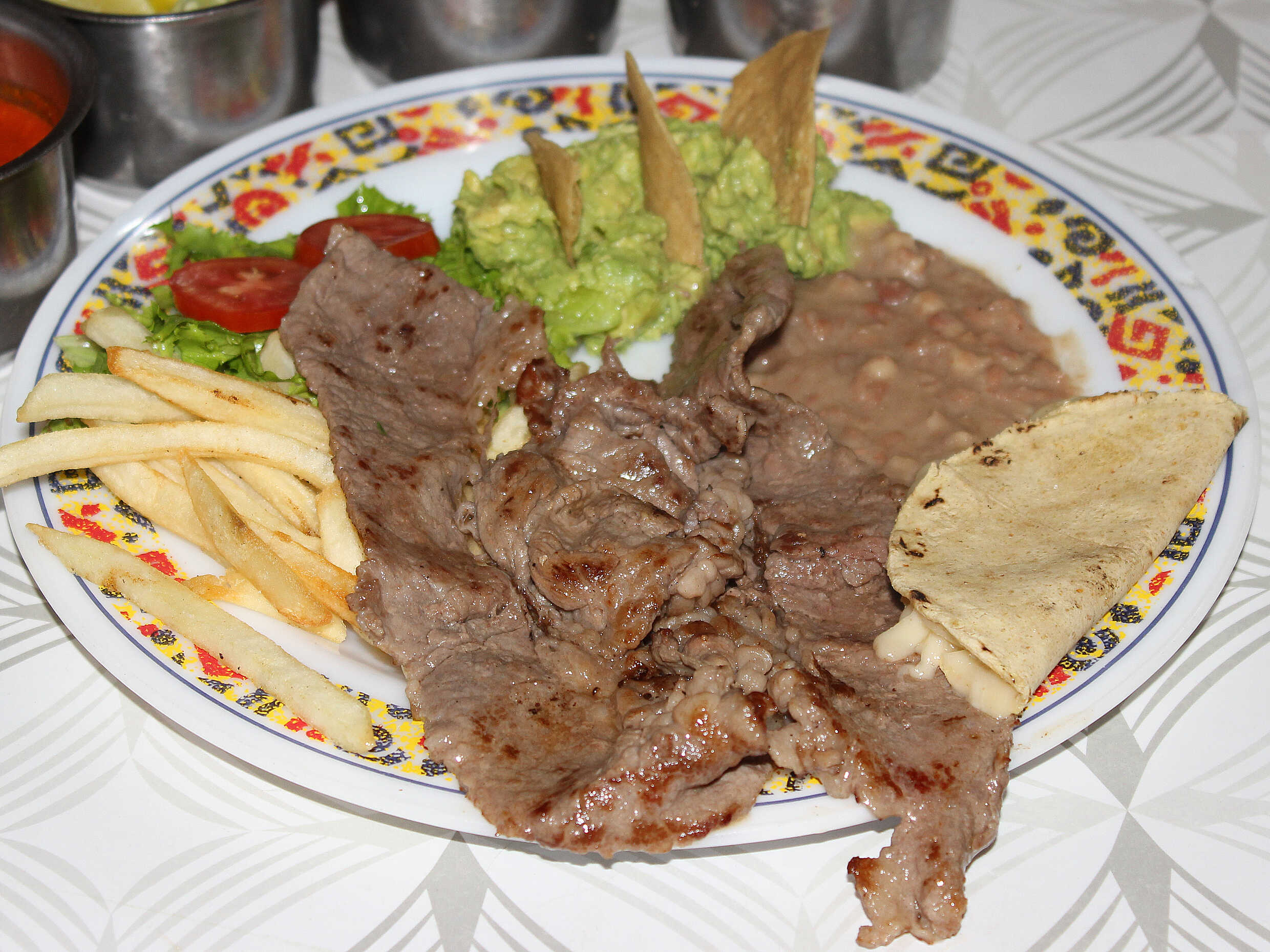 Papas a la francesa, lechuga, guacamole, frijoles y quesadilla.