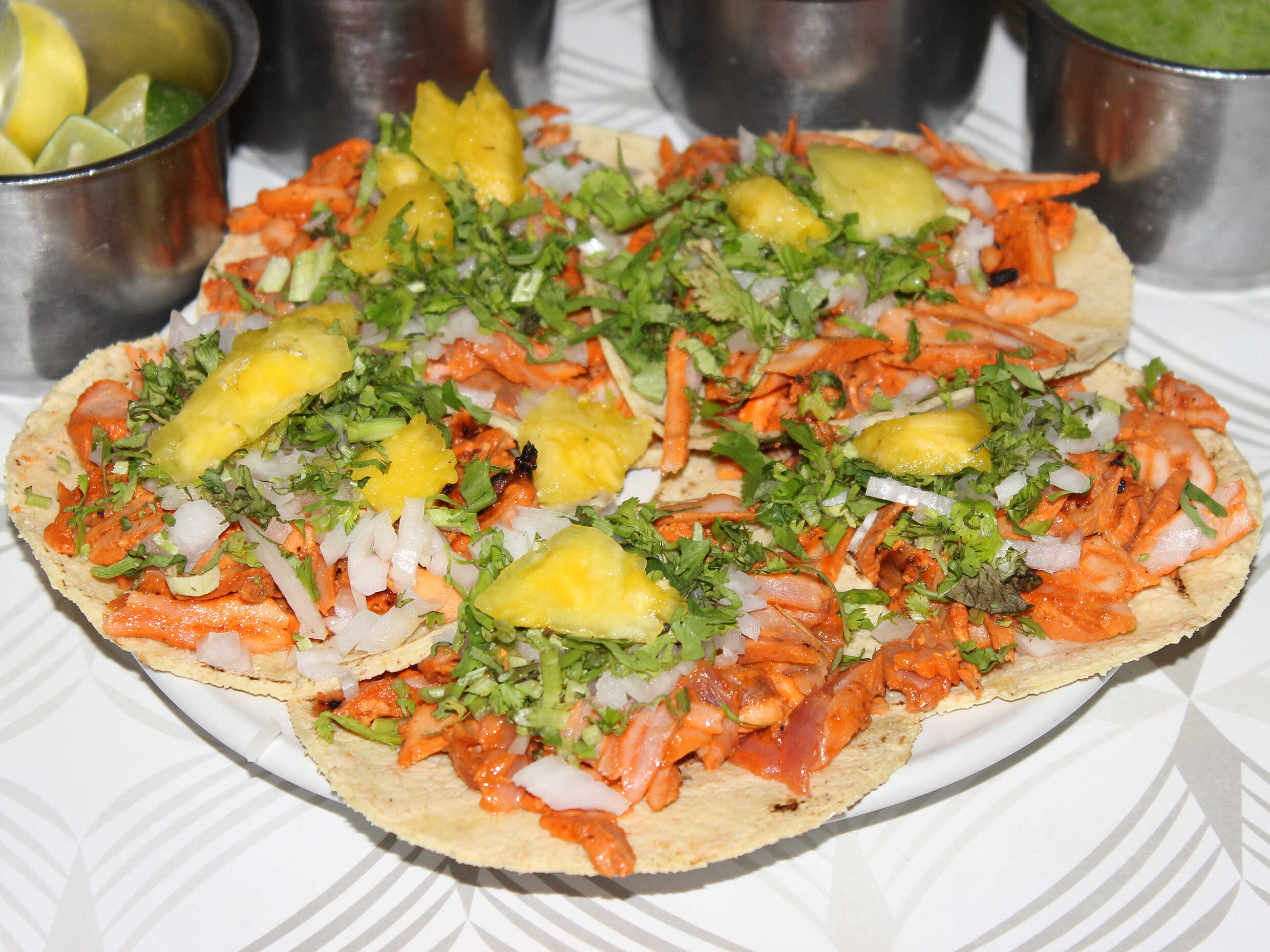 tortilla de maíz, piña, cilantro y cebolla.