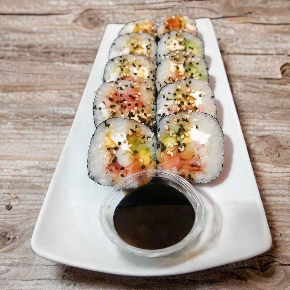 10 piezas por orden, de arroz, ajonjolí por fuera relleno de surimi, pepino, aguacate y queso.