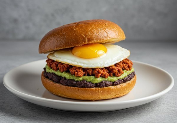 Sándwich en pan de papa con huevo estrellado, chorizo, frijol refrito y guacamole.