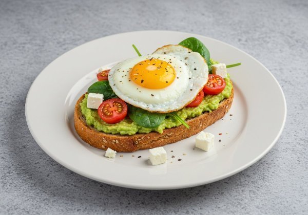 Exquisita tostada de aguacate sobre pan toscano con huevo frito tomates cherry espinaca y queso de cabra.