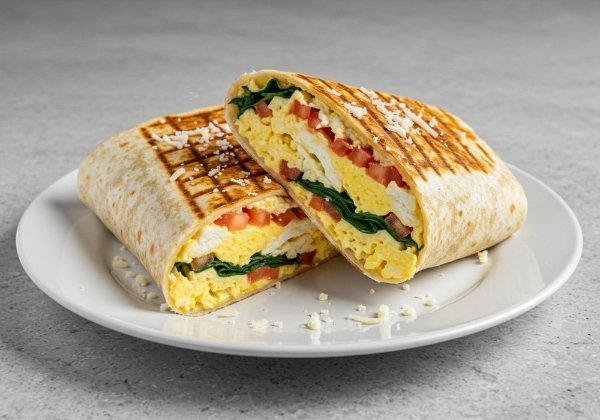 Wrap en tortilla de harina relleno de queso mozzarella espinaca fresca jitomate queso parmesano y huevo revuelto. Todo perfectamente complementado con un toque de crema.