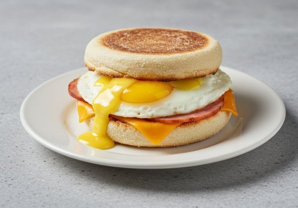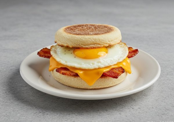 English muffin con huevo estrellado crujiente tocino y queso cheddar derretido. Un clásico irresistible para empezar el día.