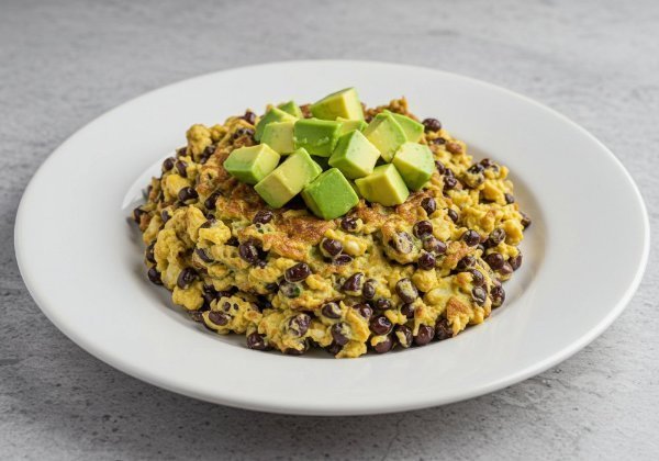 Tres huevos revueltos sobre frijoles refritos, con aguacate en cubos para un toque fresco y cremoso