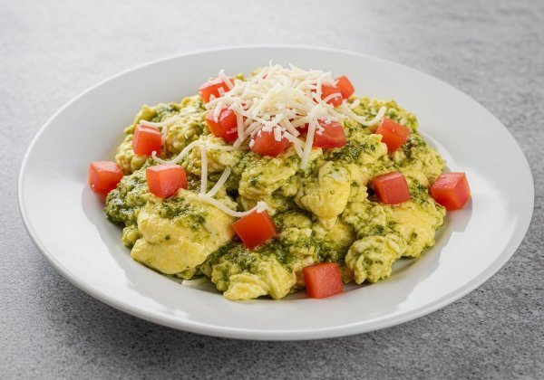 Tres huevos revueltos con salsa pesto, jitomate y queso mozzarella.